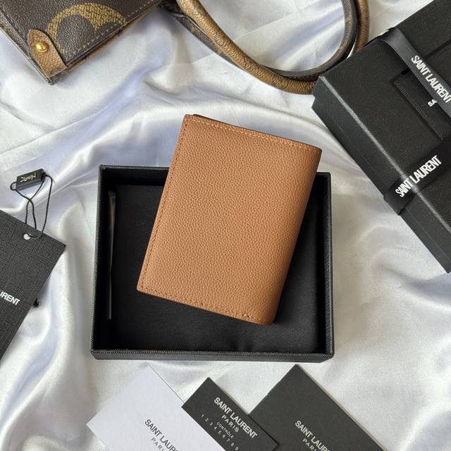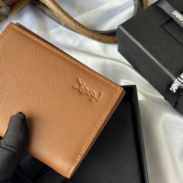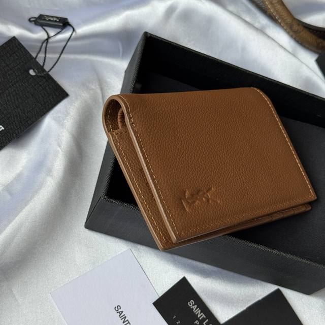 Top-quality original YSL 2025 Fall/Winter new arrival. This single-fold wallet is made of small pebbled leather with embossed lettering (Lecassandre). Dimensions: 9 x 11.5 x 2 cm (3.5 x 4.5 x 0.8 inches). Features include four credit card slots, two bill compartments, and one bill compartment with a leather lining that can hold 100-dollar bills. Item number: 668736. Color as shown in the picture.