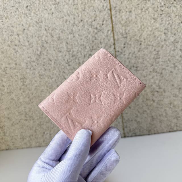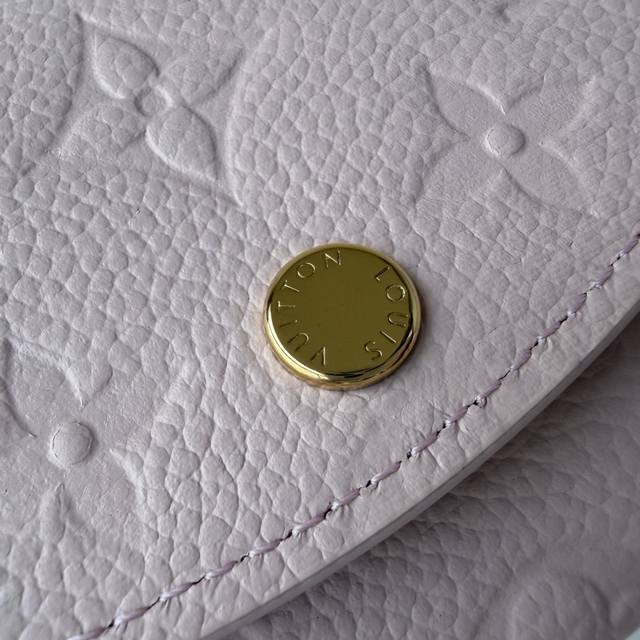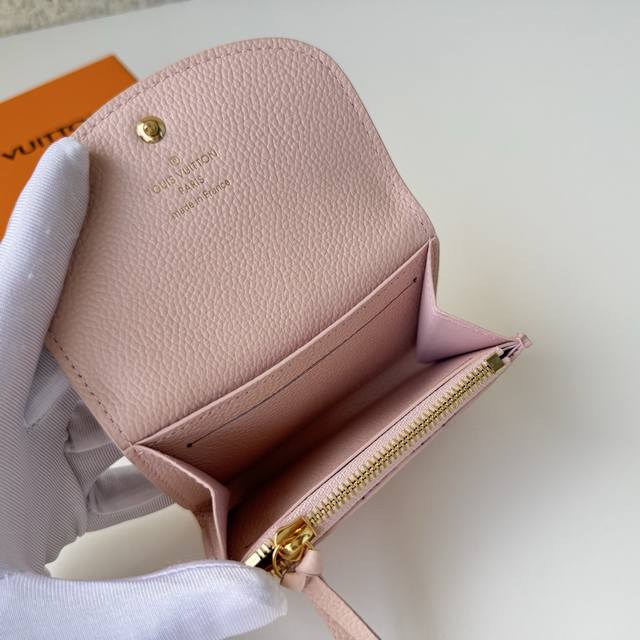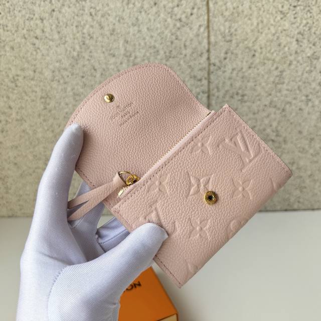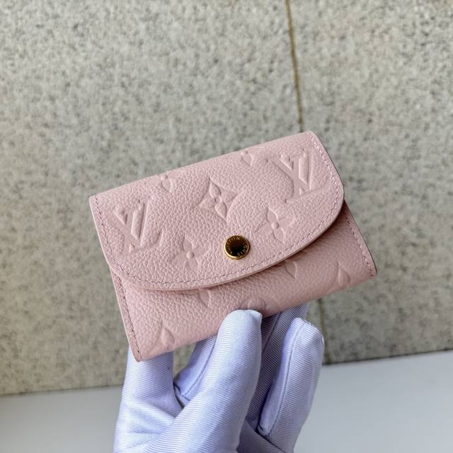 Top-tier original M26498 Rosalie coin purse in pink is crafted from Monogram Empreinte embossed soft-grain cowhide leather. It features a compact design with a rounded flap closure, an interior zippered coin pocket, a slip pocket, and a card slot. A Louis Vuitton logo snap closure ensures secure opening and closing. Dimensions: 11 x 8 x 2.5 cm. DDD