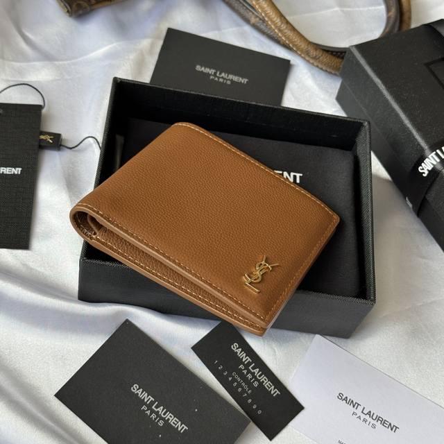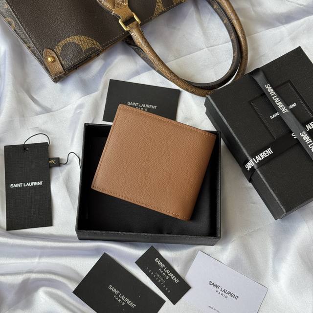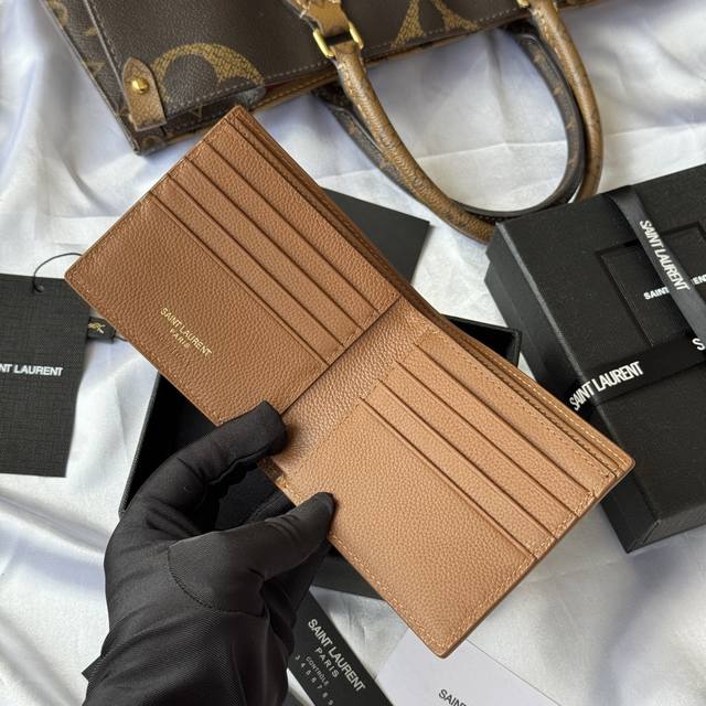 Top-tier original YSL 2025 Fall/Winter new men's wallet. Made of pebbled leather with a lining that can hold cards and bills. Features a Monogram bi-fold design and is adorned with a metal YSL logo. Interior: Two bill compartments, eight card slots, and two receipt compartments. Model: 607727. Hardware included. Dimensions: 11*9.5*2.5cm.