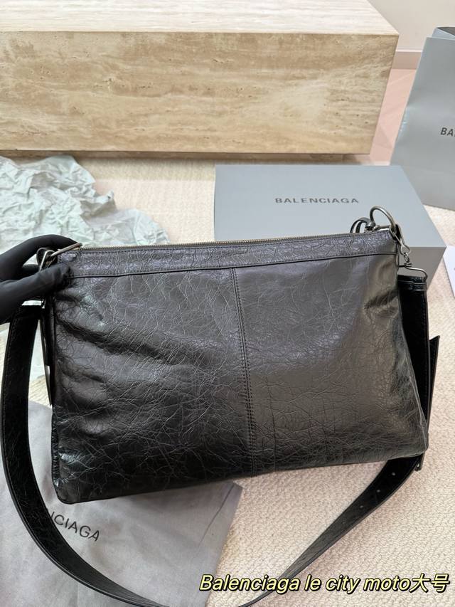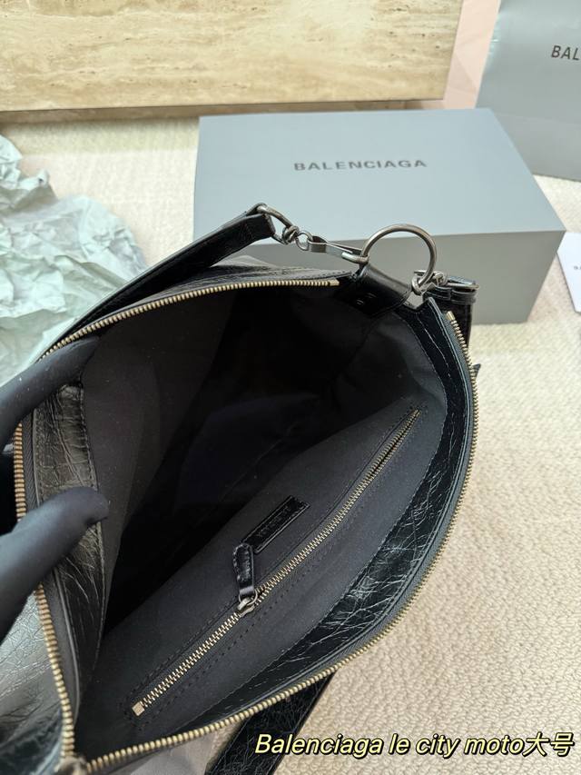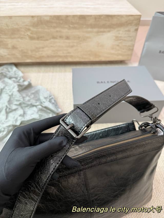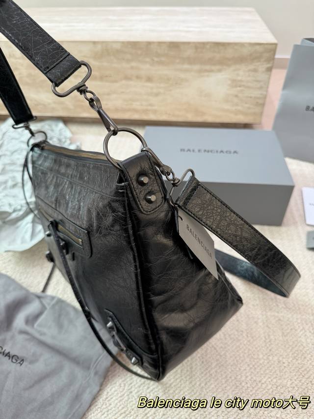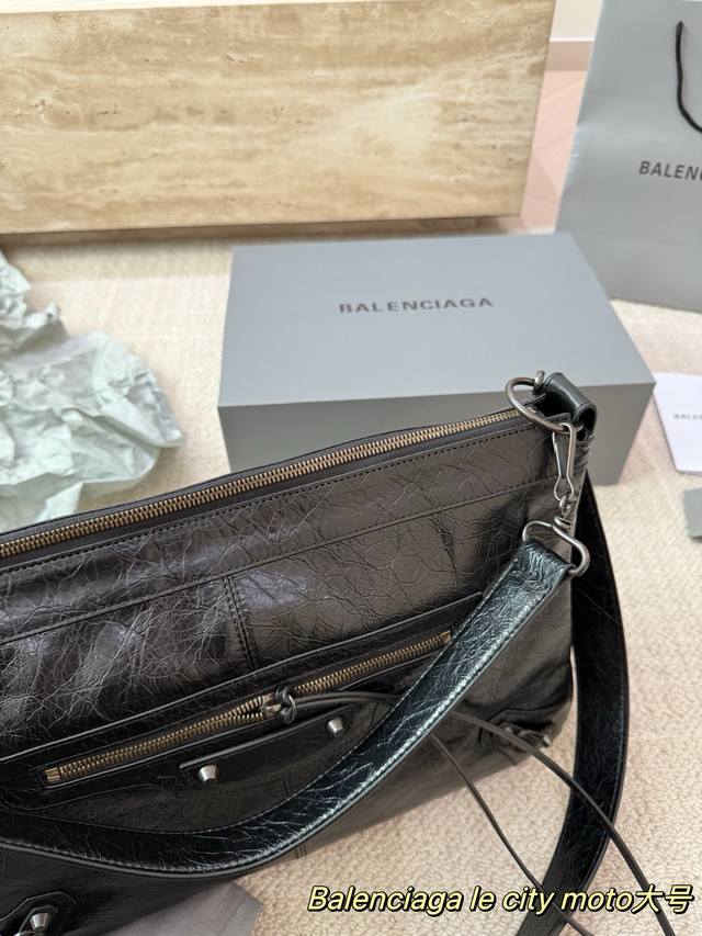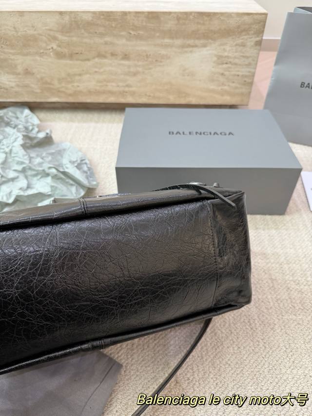 Replica Cowhide Balenciaga Le City Moto Bag. Made of black waxed cowhide with a vintage pleated texture, this Balenciaga Le City Moto bag features metal studs and a zipper, exuding a strong biker vibe that's both rugged and stylish. It comes with a detachable shoulder strap, making it suitable for hand-carrying, underarm, or crossbody wear