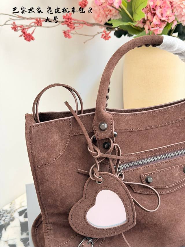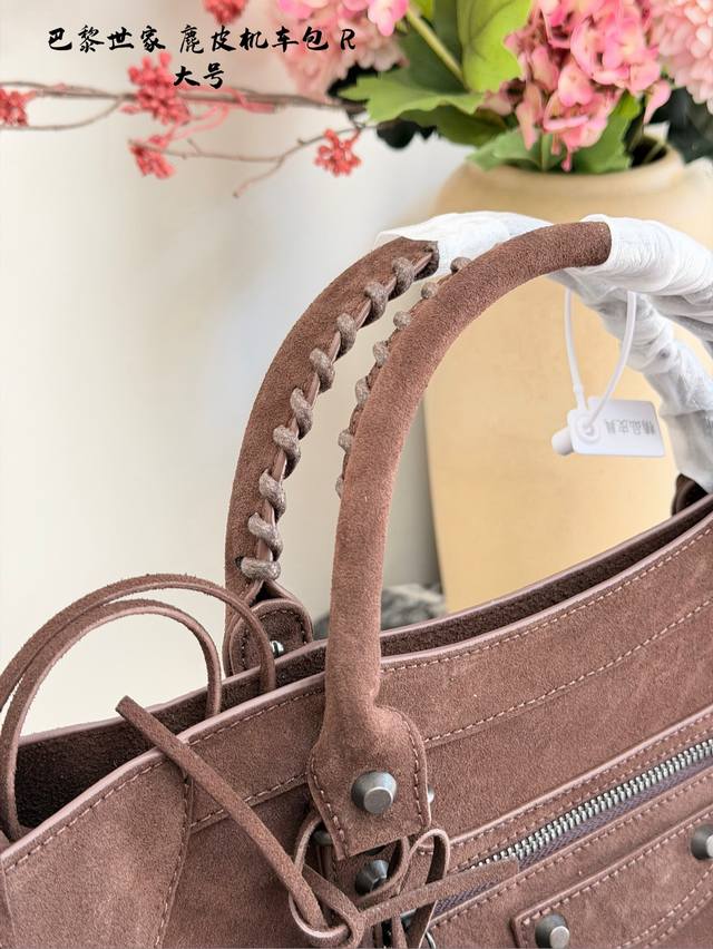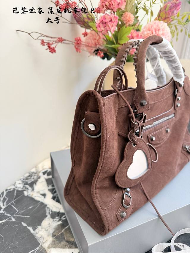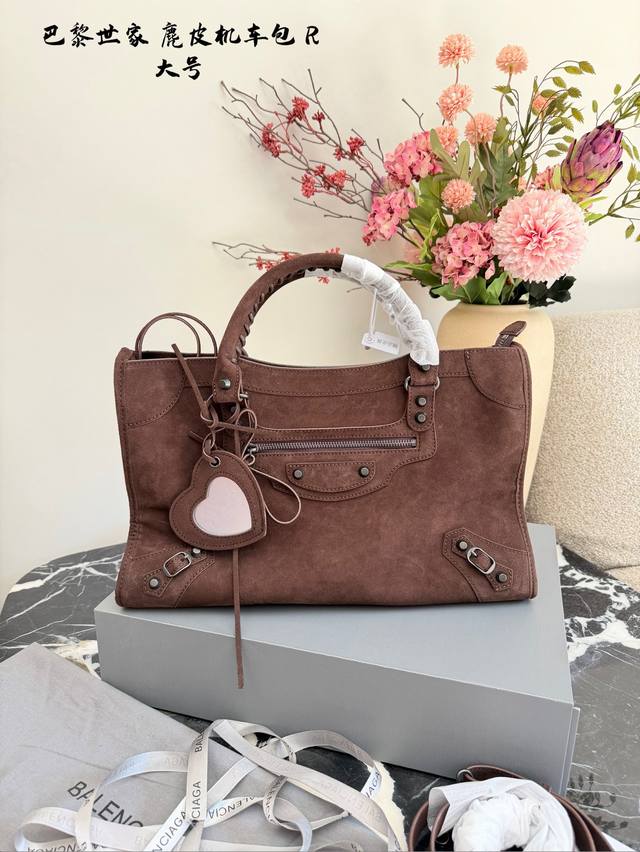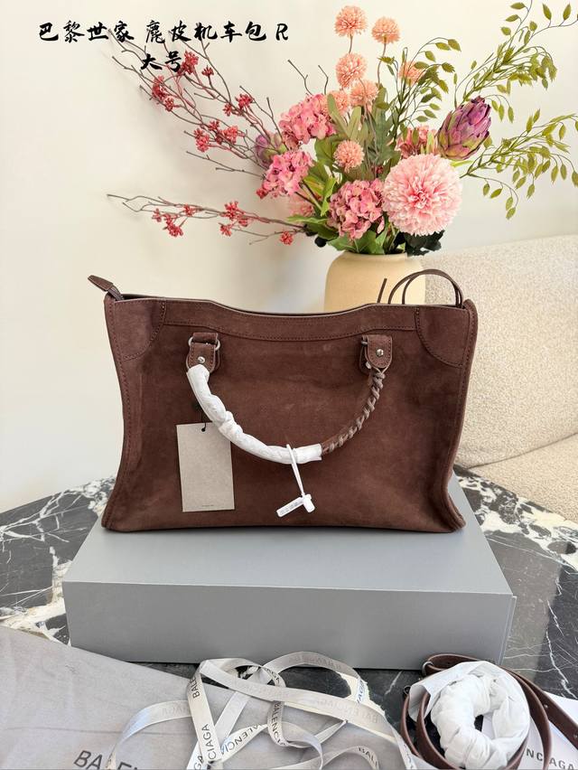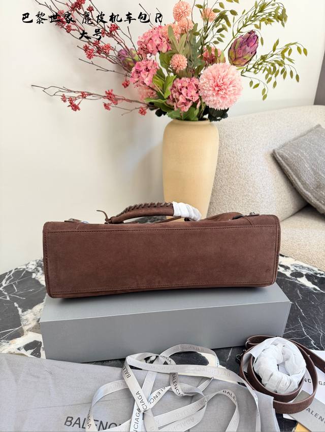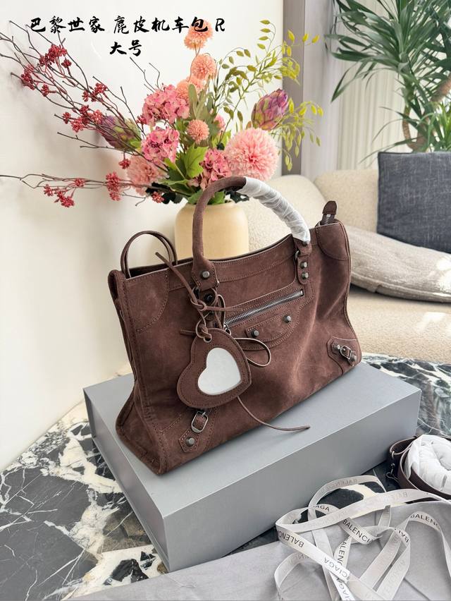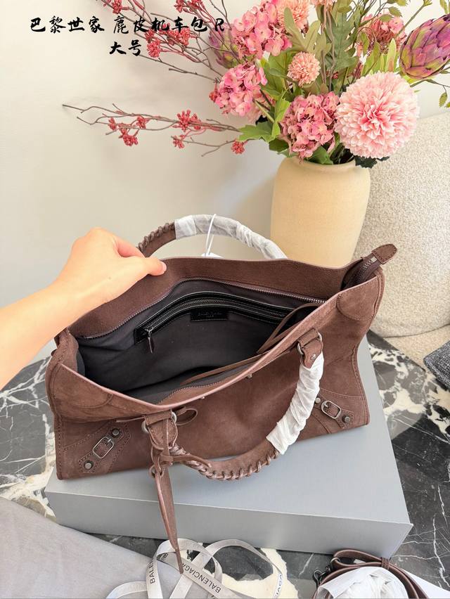 ) This Balenciaga City series suede motorcycle bag features a super luxurious chocolate brown color. The calfskin material is soft and delicate, feeling as light as a baby's skin. The studded and zipper design is both rebellious and retro. It has a large capacity, easily accommodating a 13- inch laptop and a thermos, making it perfect for commuting and short trips! The adjustable shoulder strap allows for easy hand-carrying or shoulder-carrying. It looks great with trench coats and denim jackets in autumn and winter, making it both practical and stylish