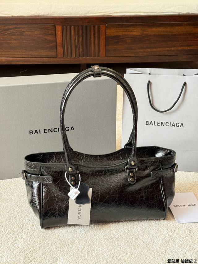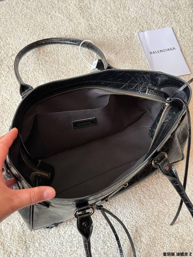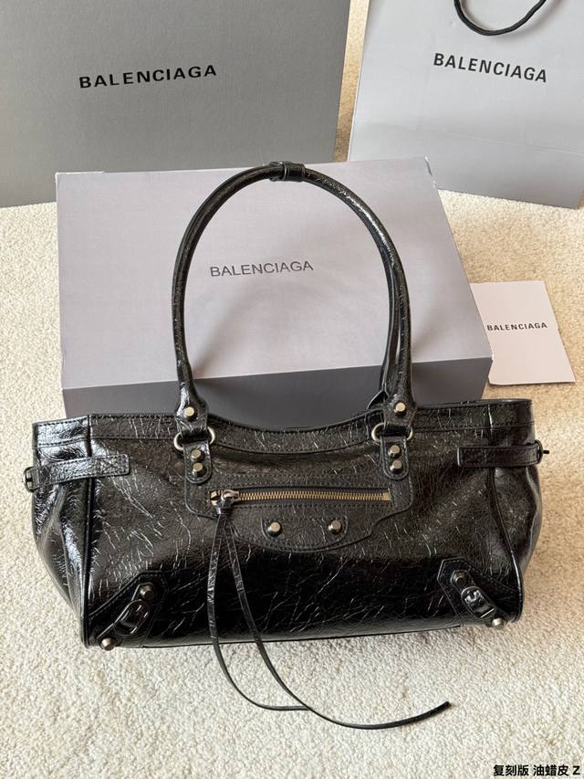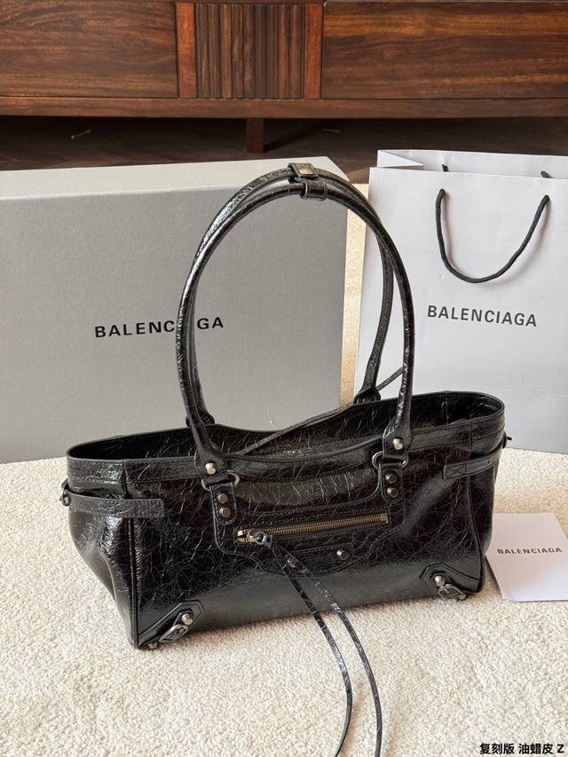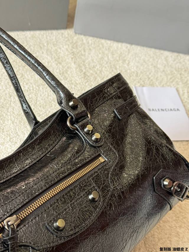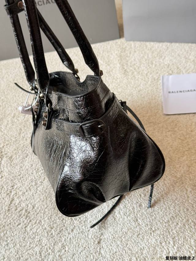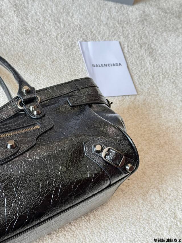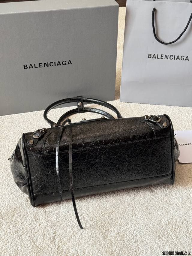 Replica Balenciaga Le City Motorcycle Bag in Waxed Leather. Made of black top-grain cowhide with metal studs, this Balenciaga Le City motorcycle bag is both retro and cool! The horizontal design offers moderate capacity, perfect for commuting. The handle can be worn over the shoulder or under the arm, and the shoulder strap can also be worn crossbody