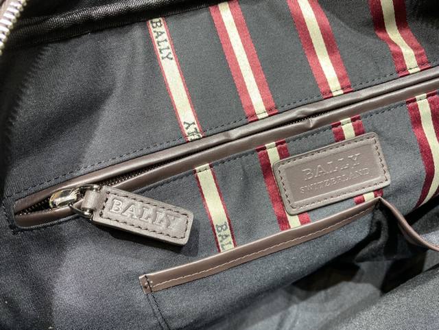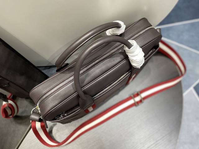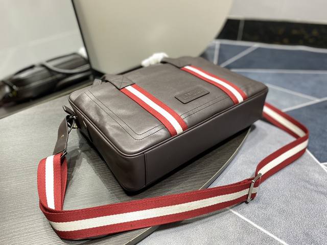 Bally Men's Briefcase Size: 39 x 8 x 30 cm. Crafted from top-grain cowhide with custom hardware, the Bally briefcase features a zipper closure for added convenience and security. The front is embellished with the brand's signature red and white Trainspotting pattern and logo, creating a simple and elegant design. With space for a laptop, it can be carried by hand, on the shoulder, or crossbody, making it the top choice for business men.
