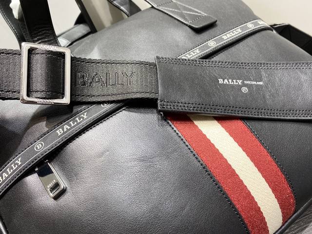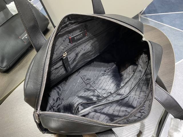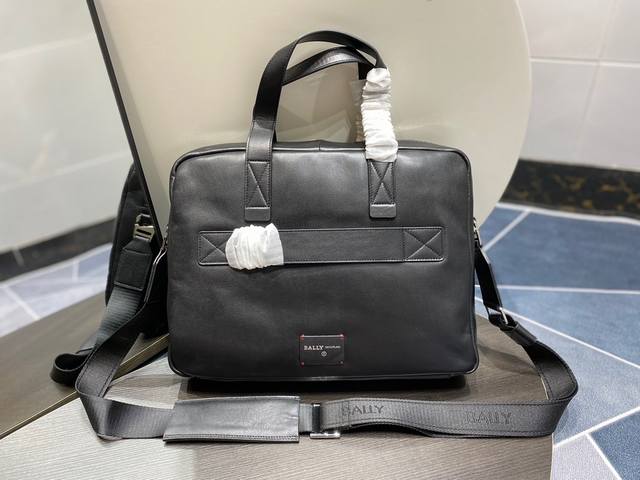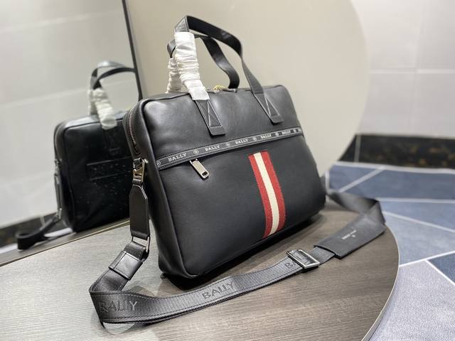 Bally Men's Briefcase Size: 39x9x30cm. Crafted from top-grain cowhide with custom hardware, the Bally briefcase features a zipper closure for added convenience and security. The front is adorned with the brand's signature red and white Trainspotting pattern and the brand logo, creating a simple and elegant design. With space for a laptop, it can be carried by hand, on the shoulder, or crossbody, making it the top choice for business men.