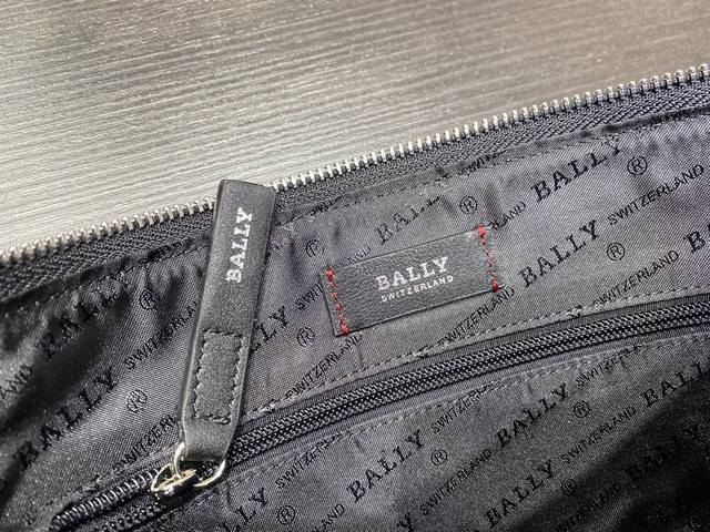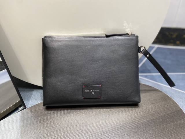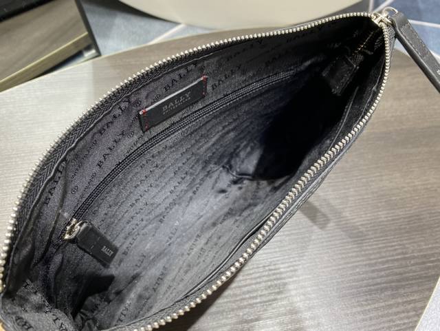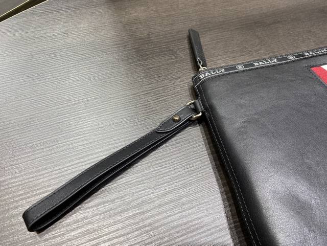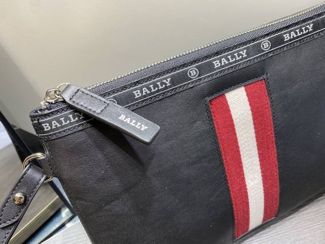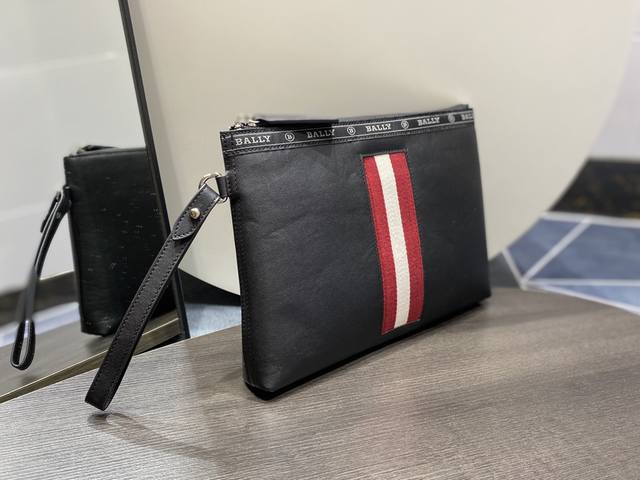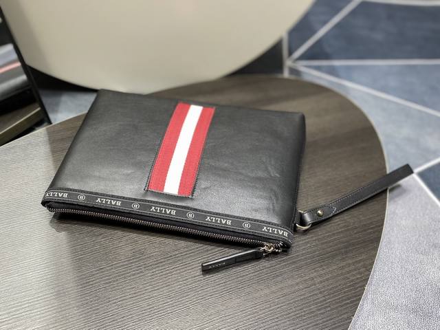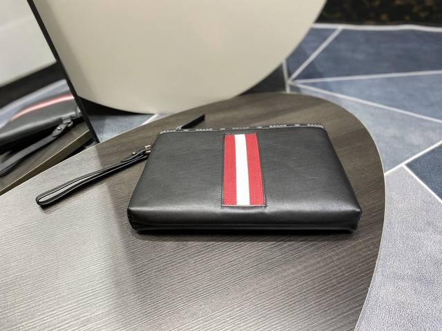 Bally Men's Clutch Size: 29 x 2.5 x 20 cm. Crafted from top-grain cowhide with custom hardware, the zipper closure is both convenient and practical, adding a sense of security. The front features the brand's signature red and white Trainspotting pattern and the brand logo, creating a simple and elegant look. Perfect for carrying or holding, for business or casual wear.