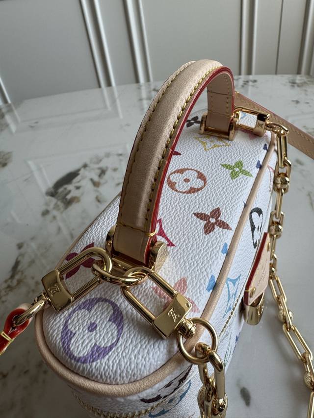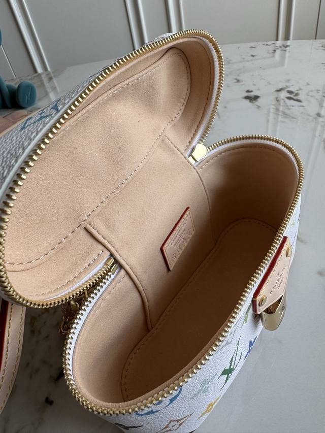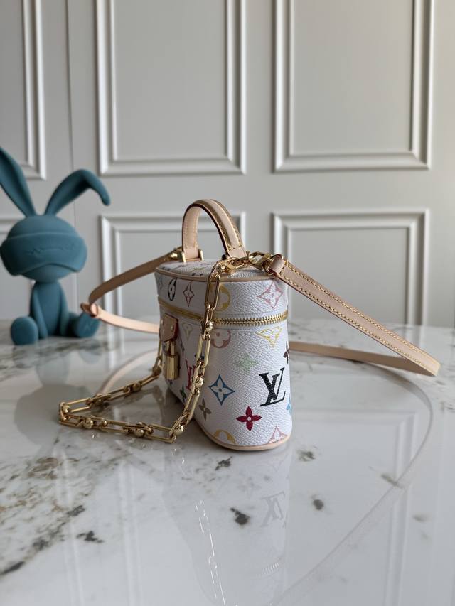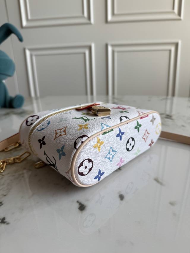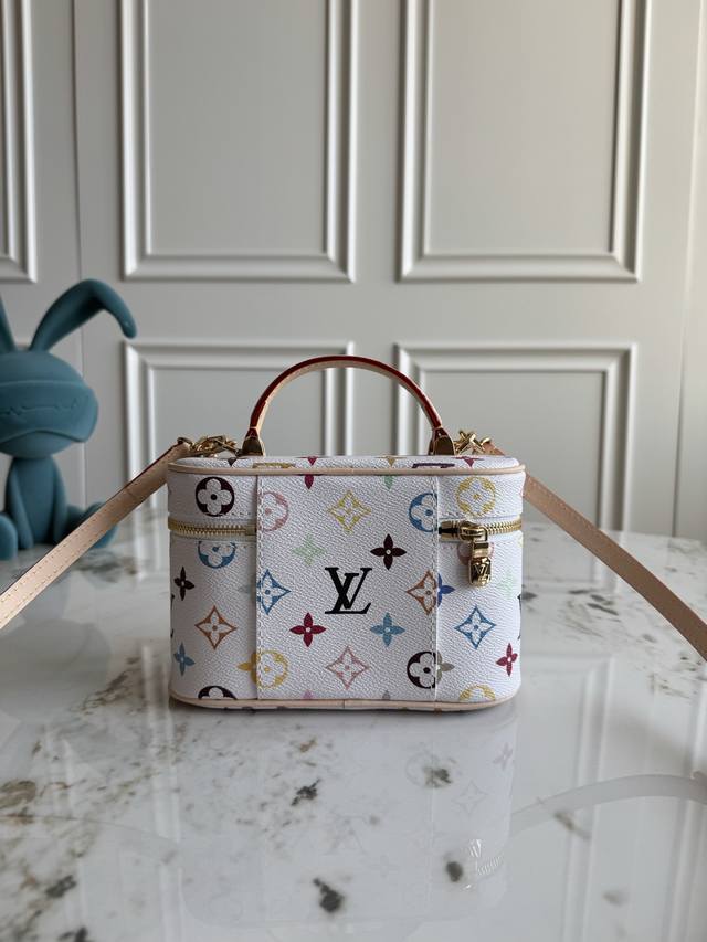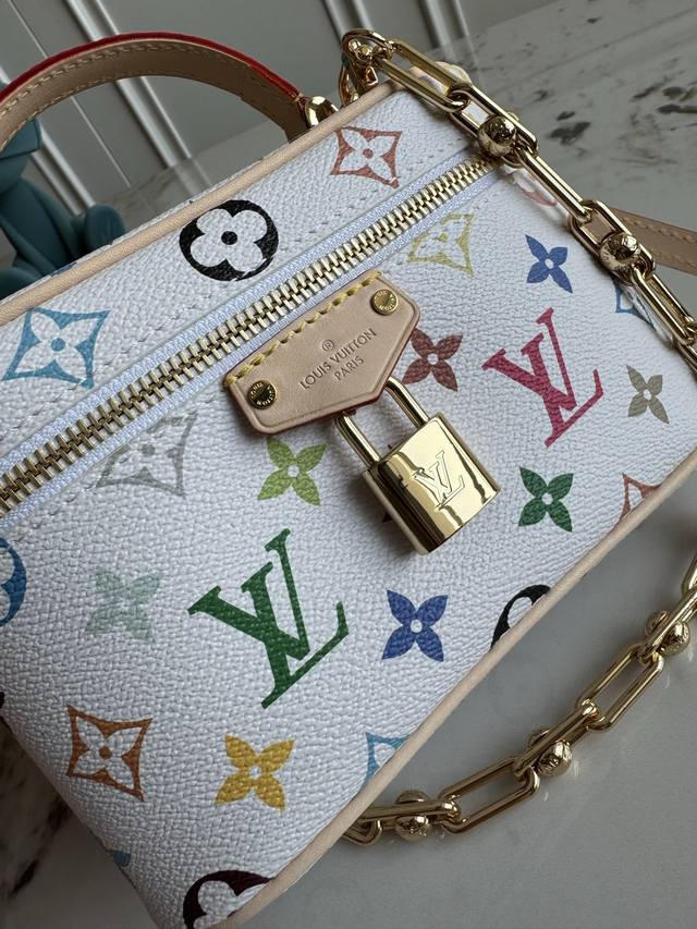 Exclusive background dynamic chip top original M13662 This Vanity Pouch handbag is from the Louis Vuitton x Takashi Murakami re-edition series, reinterpreting the brand's classic Monogram pattern with the artist's bright colors. Coated canvas is integrated with cowhide leather trim, and the zipper closure, detachable chain and LV inscription padlock add metallic luster. Size: 19