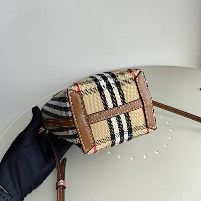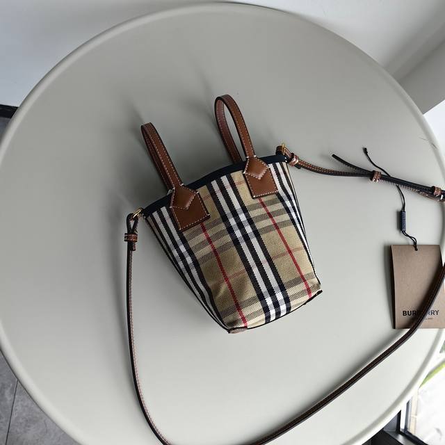 This exquisite tote bag is made of cotton canvas and decorated with Burberry check. It can be worn crossbody with an adjustable shoulder strap.