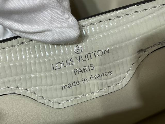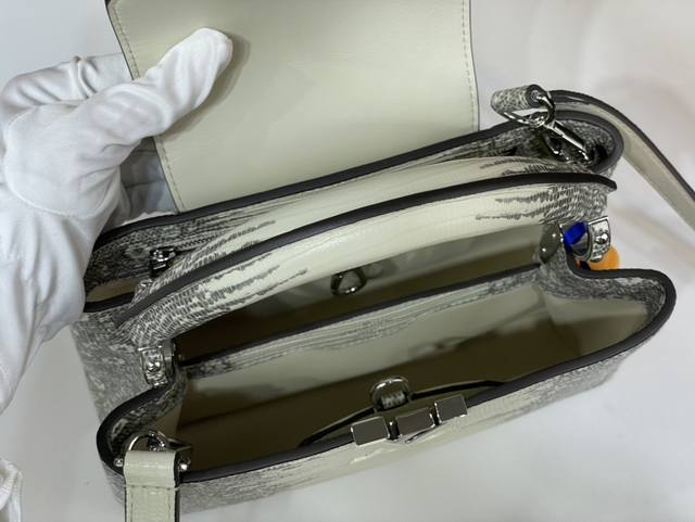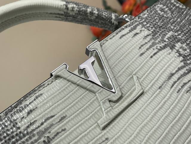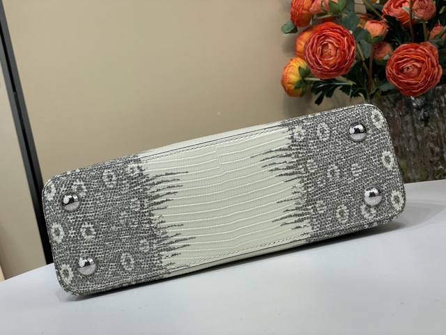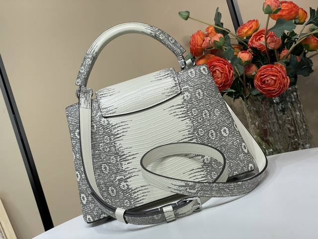 Capucinesbb handbag exquisitely combines the graceful lizard skin outer layer, delicate sheepskin lining and lustrous metal parts. The iconic flap achieves two styles: the inner cover reads the Lv logo, and the outer cover blooms the Monogram flower, and the metal chain lights up the eye-catching corner for evening occasions