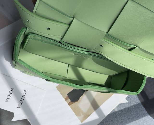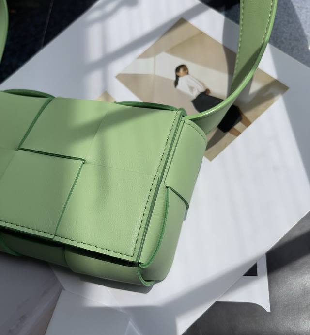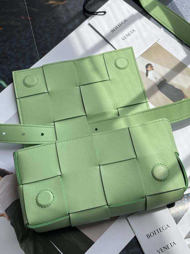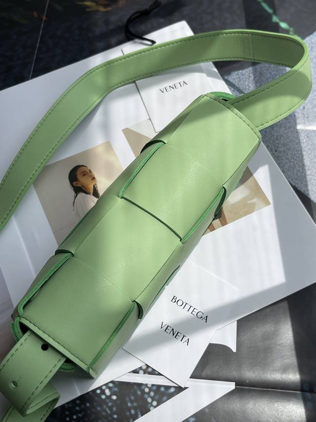 Bottega Veneta Belt Bag DDD This newly released mini belt bag is so cute! The hand-woven lambskin mini cassette exudes adorable charm that everyone loves. DDD Size: 9.5*17.5*5cm DDD Style Number: 639367 DDD Color: Mint Green DDD