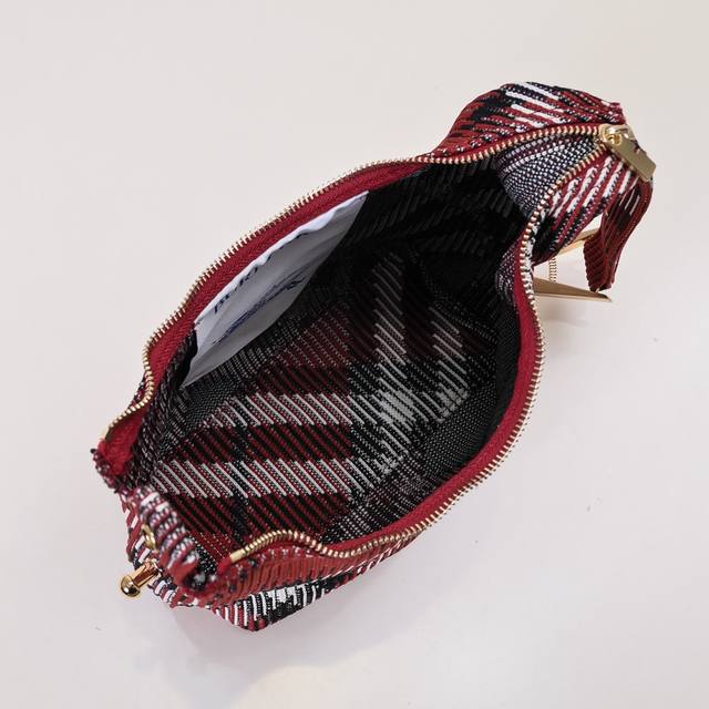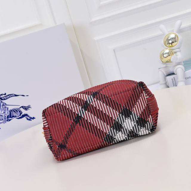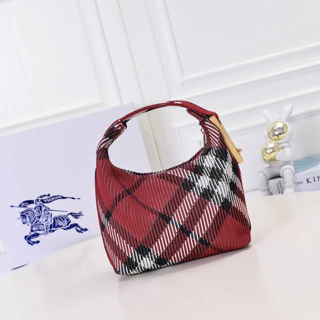 This Burberry soft, structured clip bag is crafted from Italian knit fabric and adorned with the Burberry check pattern. Lightweight and without an inner lining, it features a clip-on clasp engraved with the Burberry logo for easy attachment to the curved top handle. Features include a zip closure, brushed metal hardware, and a clip-on clasp engraved with the Burberry logo. Dimensions: 21.5 x 10.5 x 23 cm. Model: 8382.