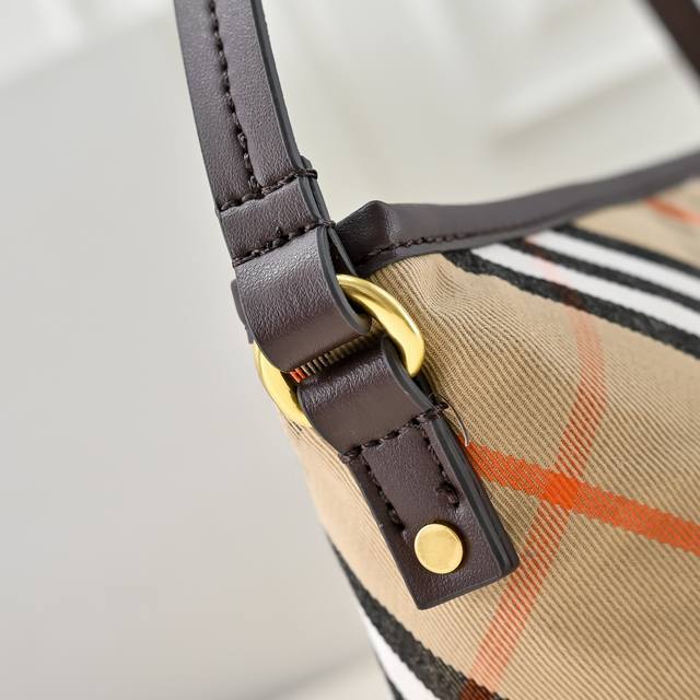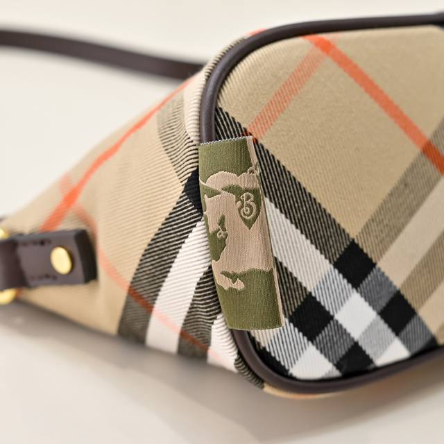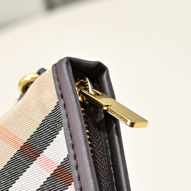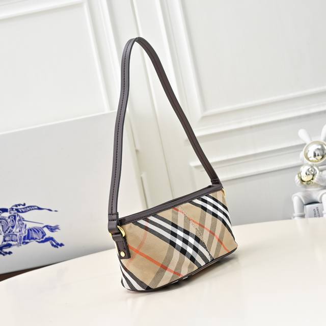 This latest Burberry underarm bag/clutch is versatile and crafted from soft cotton twill fabric. It features Burberry's signature jacquard check pattern, with the lining made of the same material. It includes a Burberry-style zipper pull and a thin leather shoulder strap. From Burberry's classic collection, this piece embodies the brand's signature style and is a wardrobe essential. Dimensions: 20 x 10 x 9 cm. Model: 8393