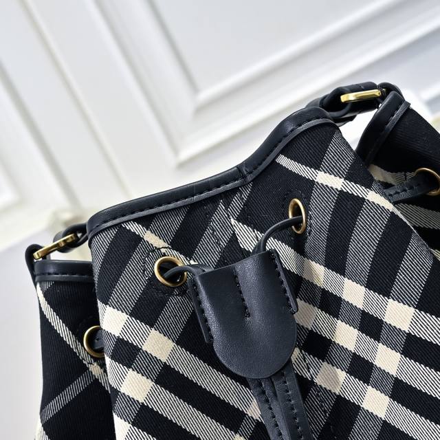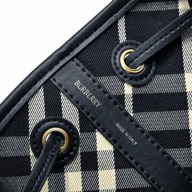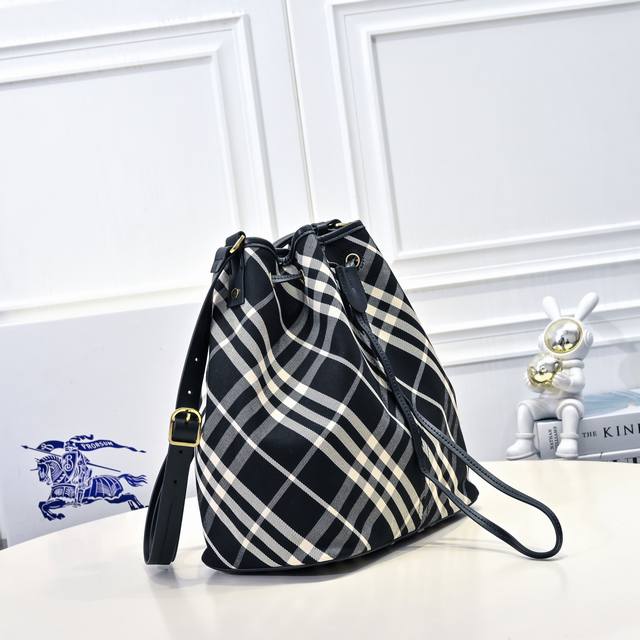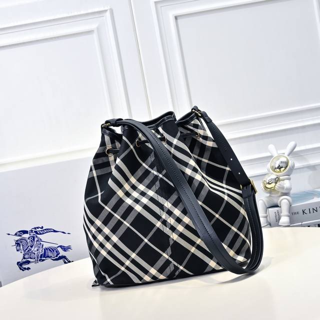 This latest drawstring bucket bag from Burberry is crafted from cotton twill fabric with an unlined design, offering a lightweight feel. It features smooth calfskin trim and an adjustable leather shoulder strap, allowing you to easily switch between shoulder and crossbody styles. From Burberry's classic collection, this essential piece embodies the brand's signature style. Dimensions: 27.5 x 16 x 29 cm. Model: 638386