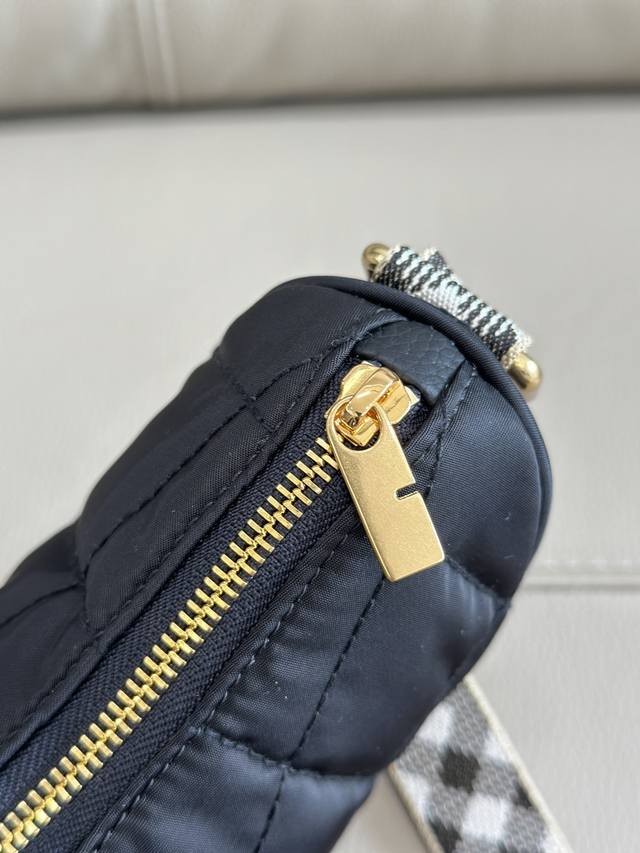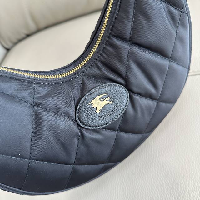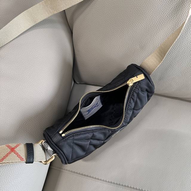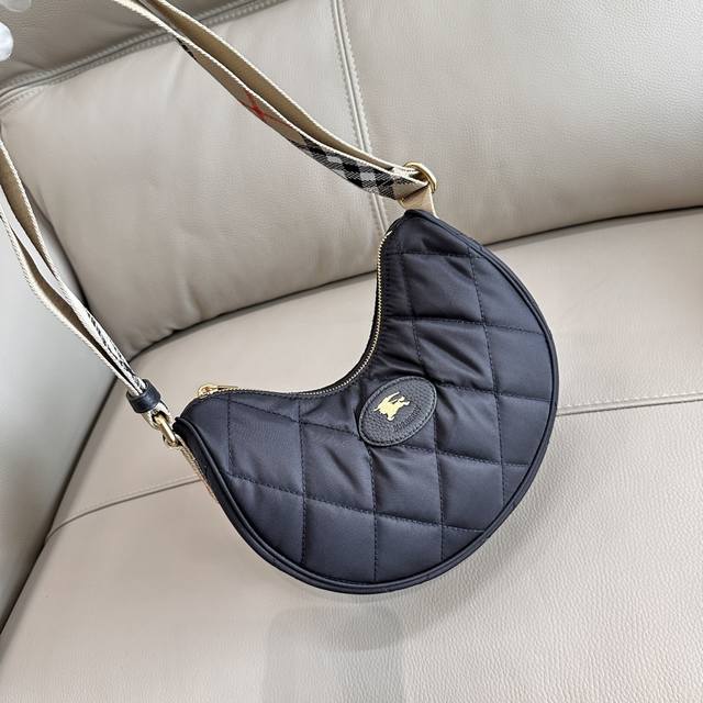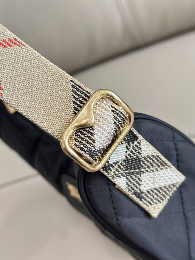 This premium version of the original Burberry Horseshoe crossbody bag draws inspiration from the elegance of British countryside. It's crafted from a quilted nylon blend and embellished with a Burberry check in new seasonal colors. It features tonal leather trim and a knight's seal, a signature pattern from the brand's 1980s bags. The adjustable mesh shoulder strap allows for easy switching between shoulder and crossbody styles. Dimensions: 23.5*18*7,