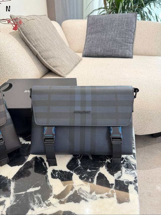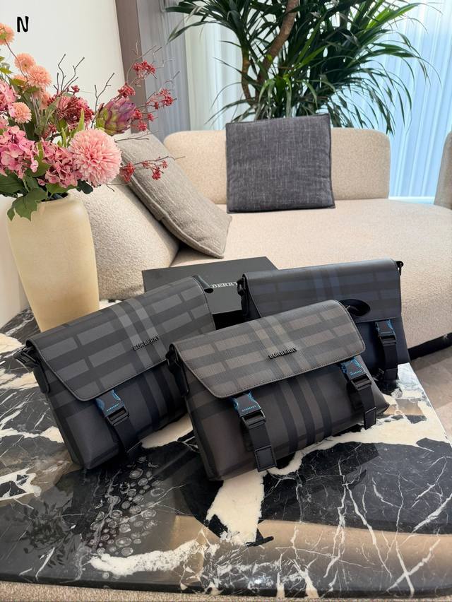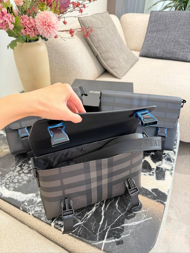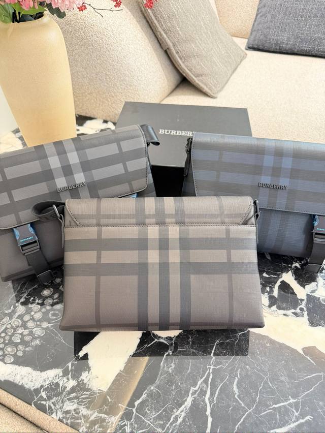 Burberry Charcoal Grey Check Messenger Bag DDD This Burberry charcoal grey check messenger bag features classic check canvas with calfskin trim, exuding understated elegance. Measuring approximately 29 x 8.5 x 17.5 cm, it offers a well-organized interior, suitable for both commuting and everyday use. DDD