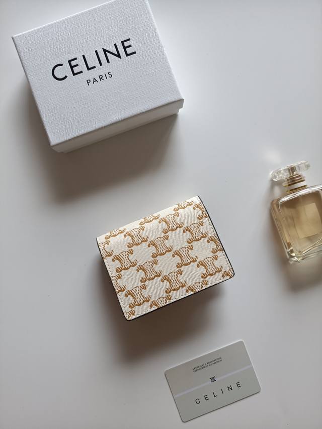 Celine new card holder, Triomphe business card holder, classic pattern large surface with flat microfiber inside, gold-finished Triomphe metal snap button closure, 1 thickened main compartment, 3 inner card slots.
