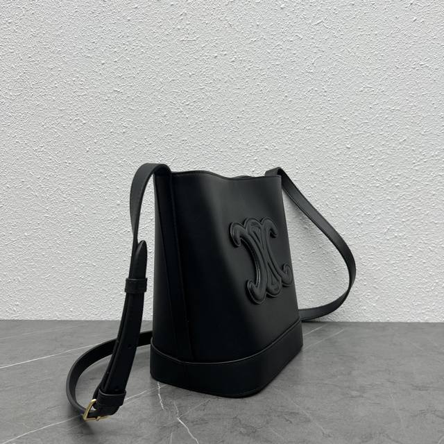 Celine's new spring/summer Cuir bucket bag features a large, 3D Arc de Triomphe logo for a sophisticated and sophisticated look. Made of premium cowhide, the bag features a full-leather upper for a lightweight feel. The shoulder strap is adjustable, and the bag features an internal button for crossbody wear. Highly recommended for students and mothers alike, this bag is spacious enough for any occasion.