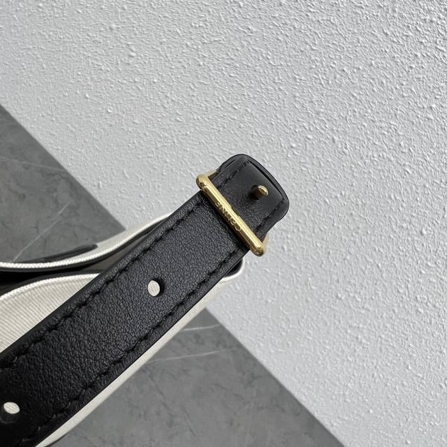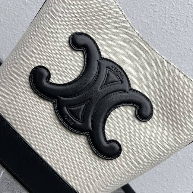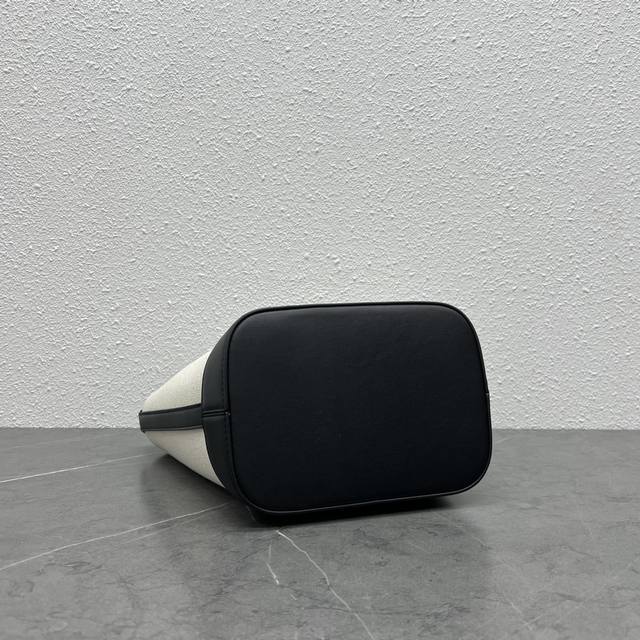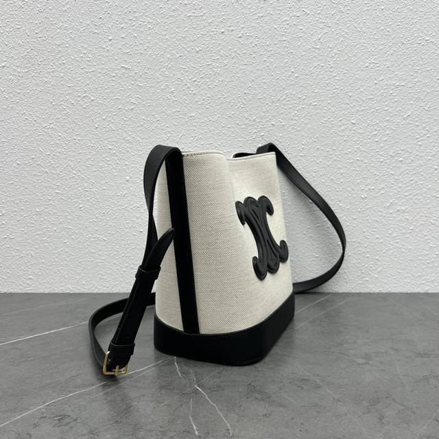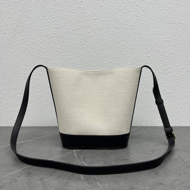 Celine's new spring/summer Cuir bucket bag features a large, 3D Arc de Triomphe logo for a sophisticated and sophisticated look. The cowhide and linen fabric create a premium feel, with a cowhide base and a lightweight upper. The shoulder strap is adjustable, and the bag features buttons inside for crossbody wear. Highly recommended for students and mothers alike, this bag has ample storage space. Style number: 198243 Linen black