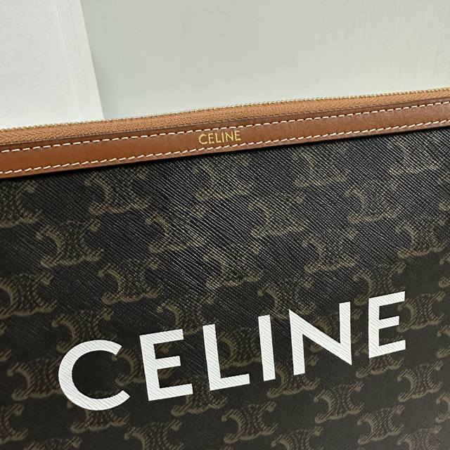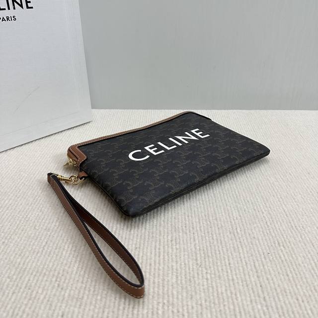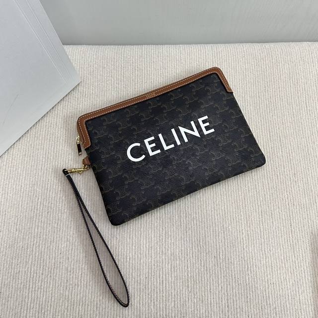 This Celine clutch, the basic model has a hand strap added for greater practicality. The brown leather edging at the zipper echoes the logo, adding a unique feel. The workmanship is fine and the lines are exquisite. It comes with a hand strap and is very practical. Model number: 10J502