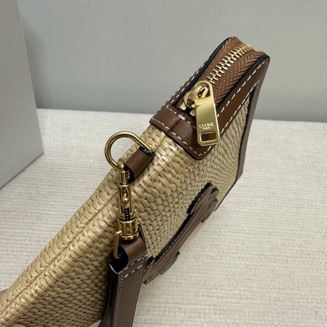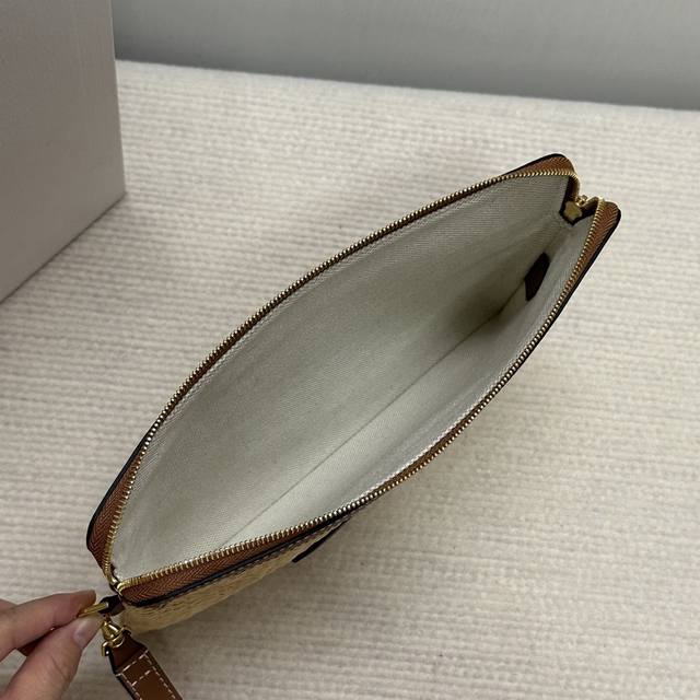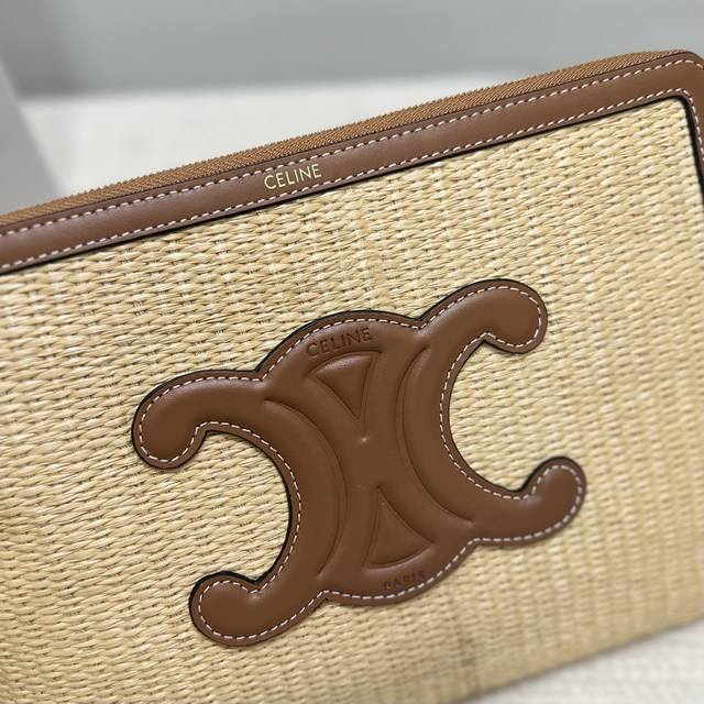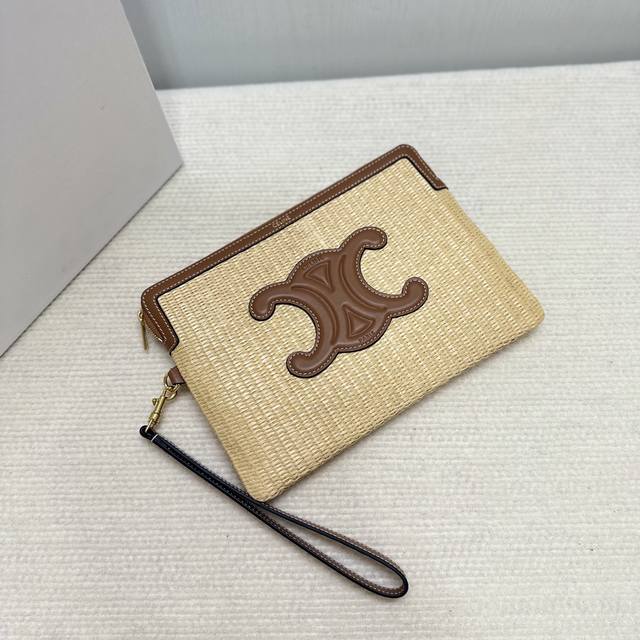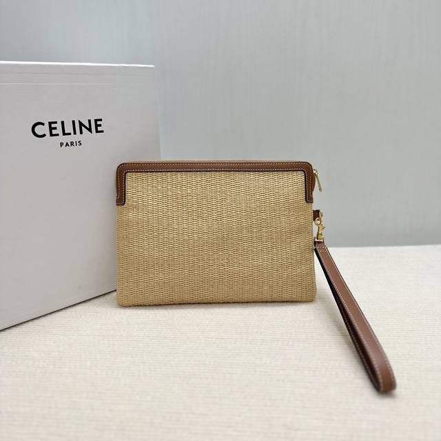 This Celine clutch, the basic model has a hand strap for greater practicality. The brown leather edging at the zipper echoes the logo, adding a unique feel. The workmanship is fine and the lines are exquisite. It comes with a hand strap and is very practical