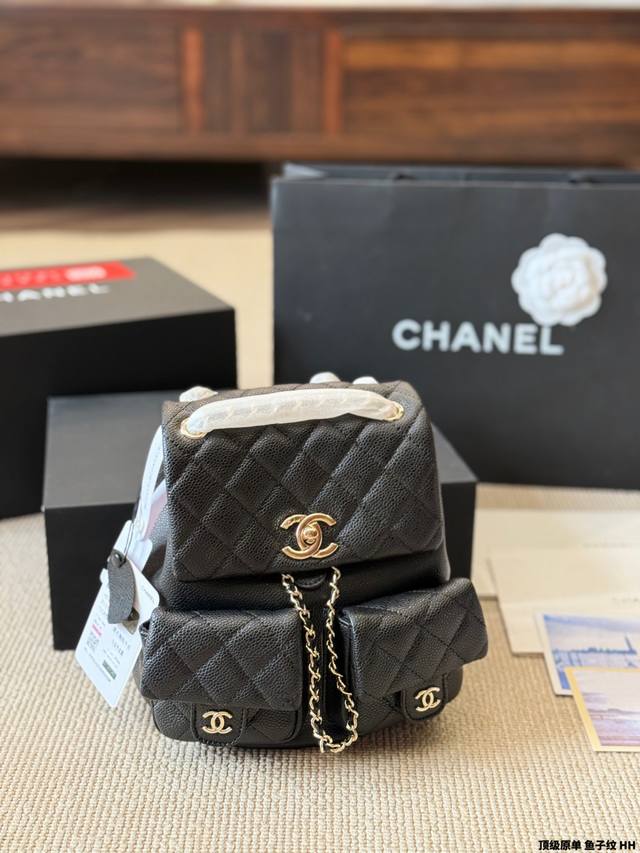 Replica Chanel Duma 23p Double Pocket Backpack (Caviar Texture). Made of black pebbled leather with light gold hardware, this Chanel Duma 23p double pocket backpack features a classic quilted design, drawstring flap, and two pockets. Practical and stylish, it measures approximately 21cm, making it suitable for commuting or short trips. It can be easily carried by hand or worn crossbody. The pebbled leather is durable and easy to care for, resisting scratches even with daily use. The interior is well-organized, accommodating sunglasses, a compact powder, and a power bank. Combining functionality and brand prestige, this is a popular Chanel backpack style !