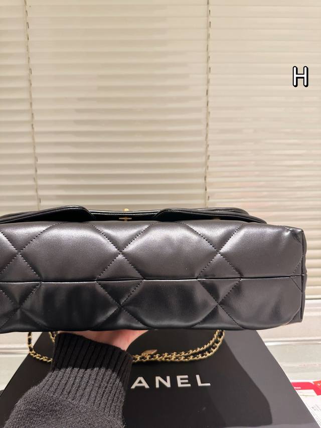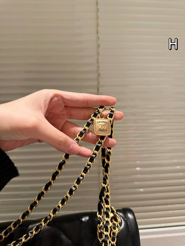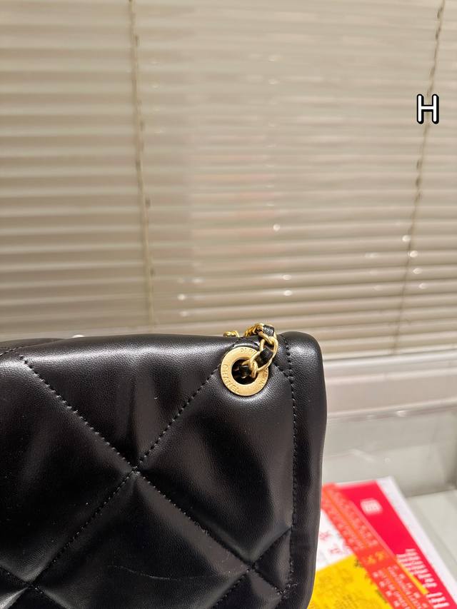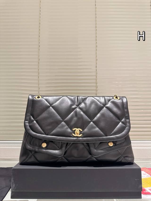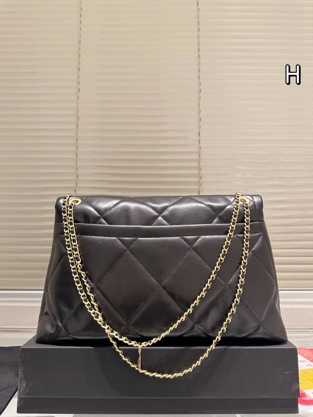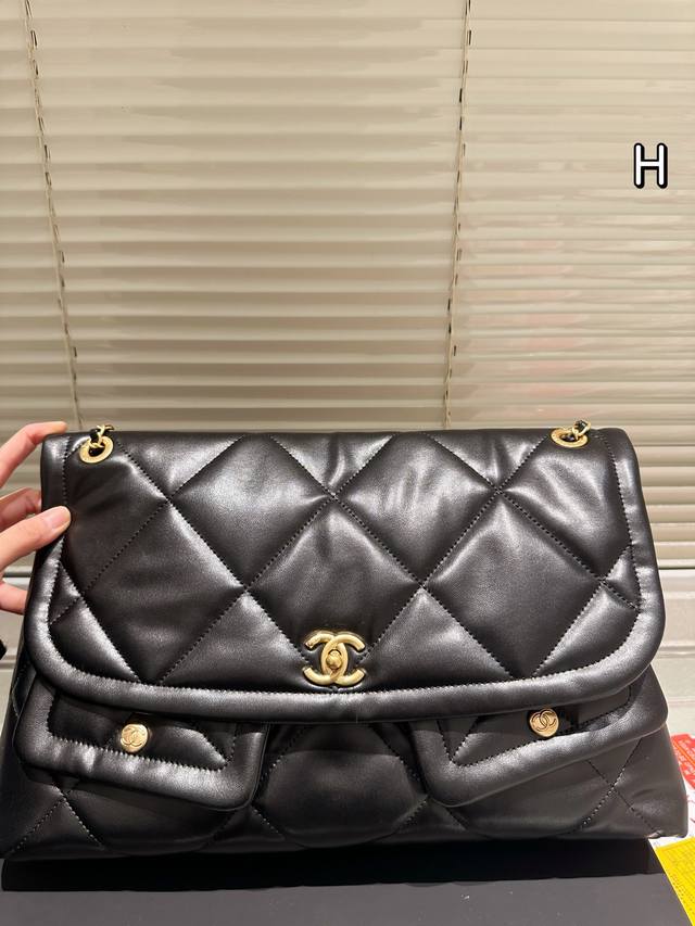 Replica Lambskin Chanel 25K Double Pocket Hobo Bag. This Chanel 25K series double pocket hobo bag features black calfskin with classic quilted detailing, a gold double C logo, and a chain, exuding vintage elegance. The flap and double pocket design is both practical and distinctive. The bag is soft, spacious, and suitable for both work and leisure. The small gold tag on the chain is exquisite, showcasing impeccable attention to detail. Approximately 40cm in size, it looks stylish whether carried by hand or over the shoulder, making it a perfect addition to any autumn/winter wardrobe.