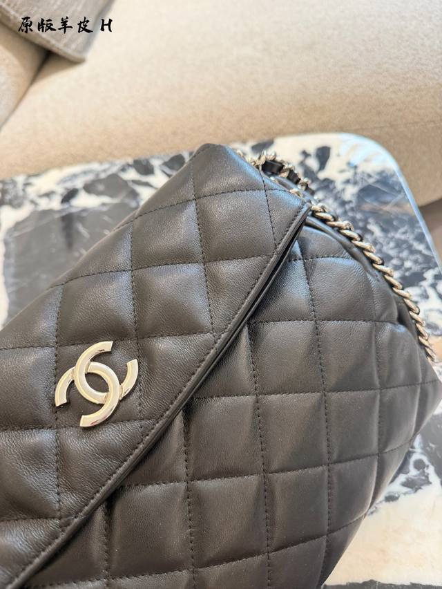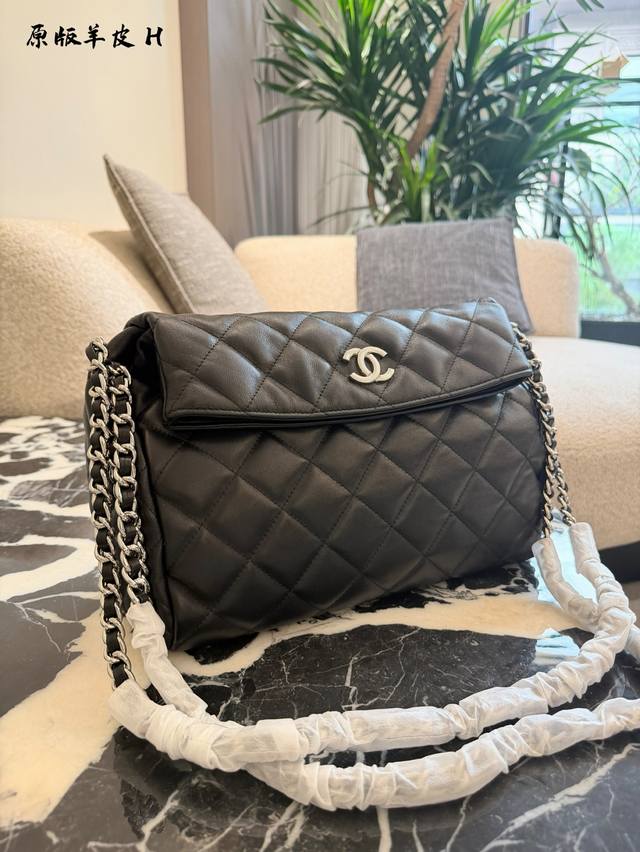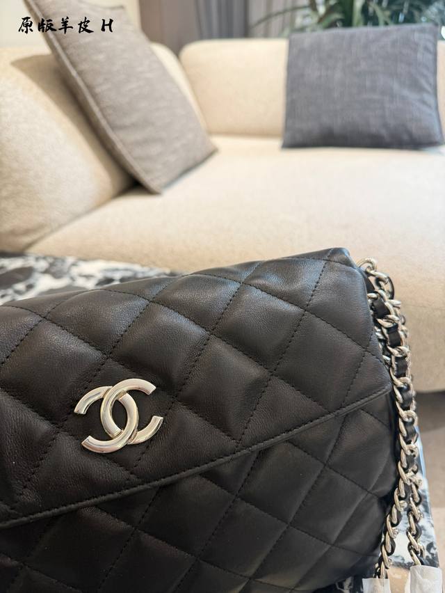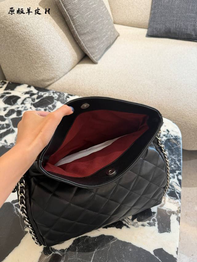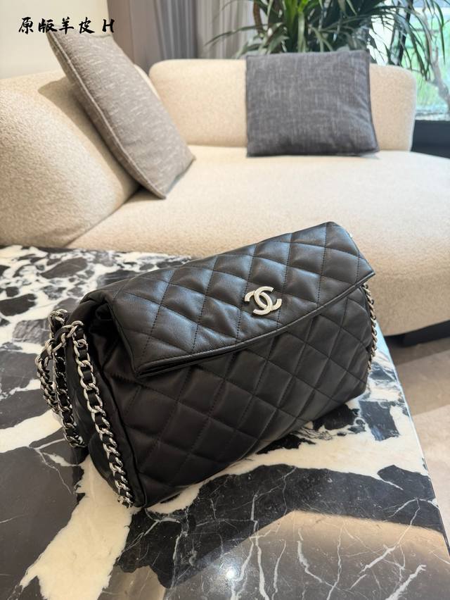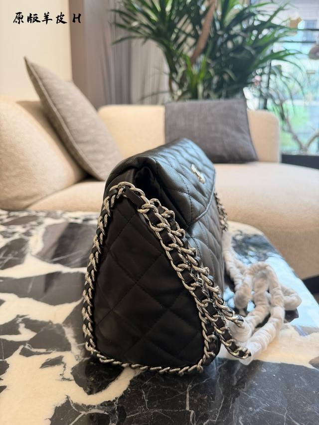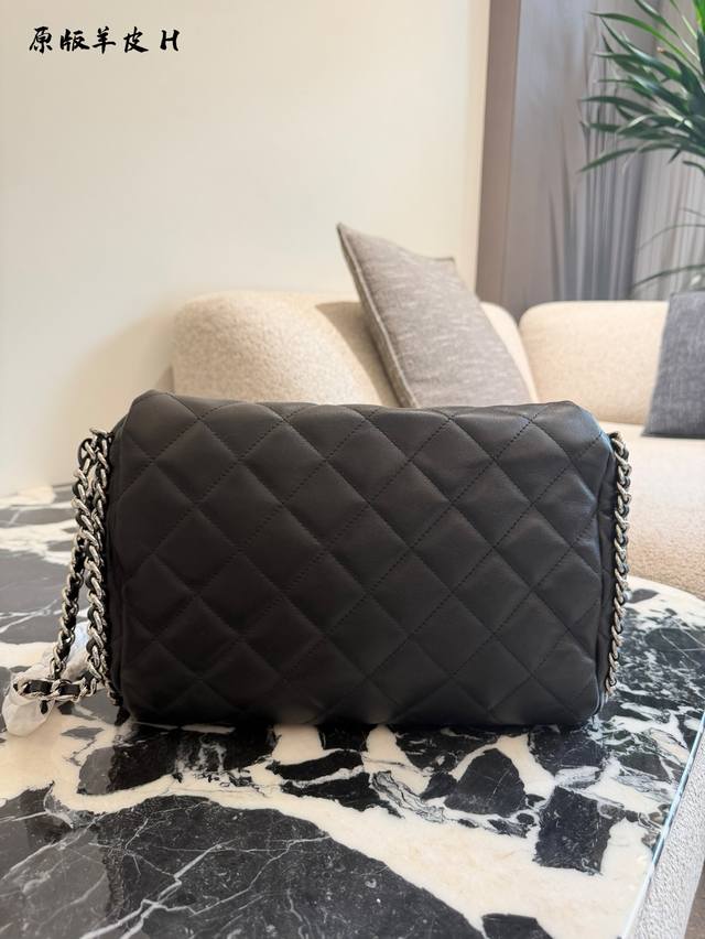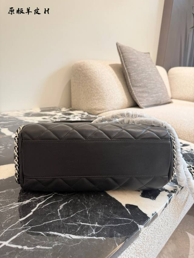 Vintage Chanel Chain Bag with Trimmed Edges DDD This vintage Chanel chain bag features black lambskin with classic quilted stitching. The leather is soft and supple, with a distinctive silver chain and double C logo. The unique trim design gives it a punk vibe. Measuring approximately 30 x 23 x 10 cm, it's suitable for both work and casual occasions. The chain is adjustable, allowing for crossbody or hand-carry options. Practical and stylish, it's a favorite in the vintage market and a must-have for fashion bloggers and style icons. It instantly elevates your everyday style. DDD