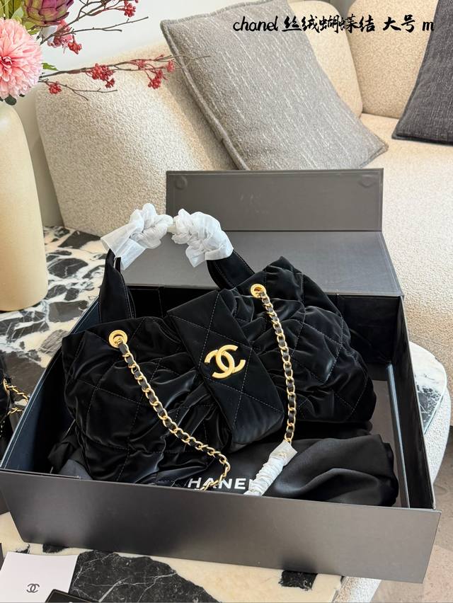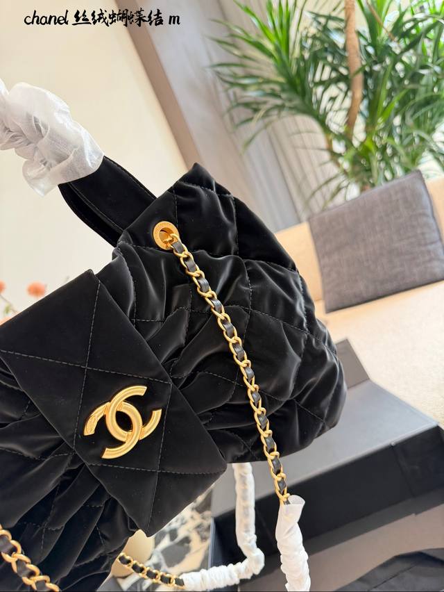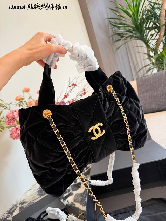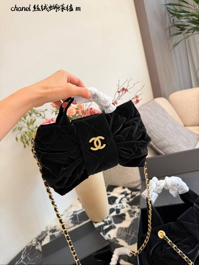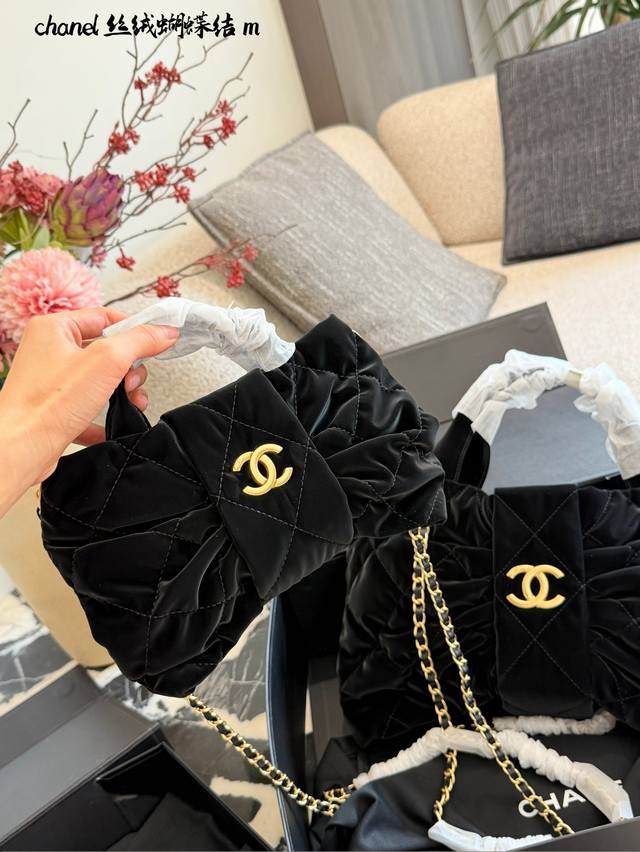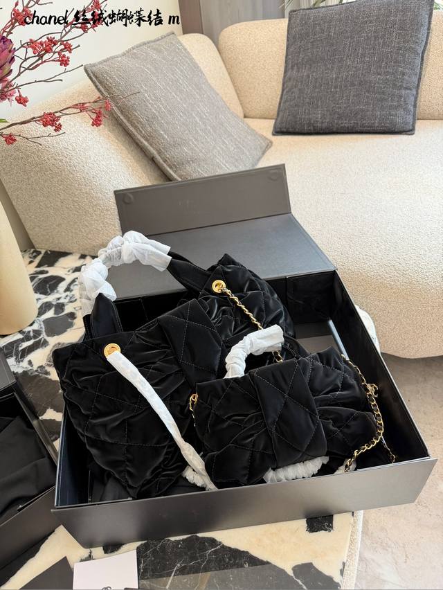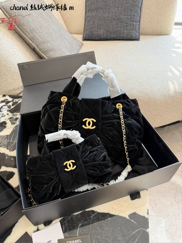 Chanel 25K Velvet Bow Bag DDD This Chanel 25K series velvet bow bag features black velvet with a gold double C logo, exuding elegant and vintage charm. Small size: 18 x 26 x 5 cm; Large size: 42 x 51 cm. Features a diamond quilting pattern, making it soft to the touch and lint-free. Perfect for autumn and winter. DDD