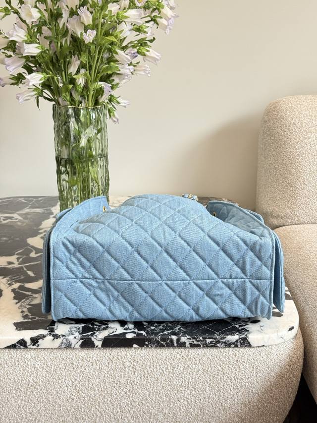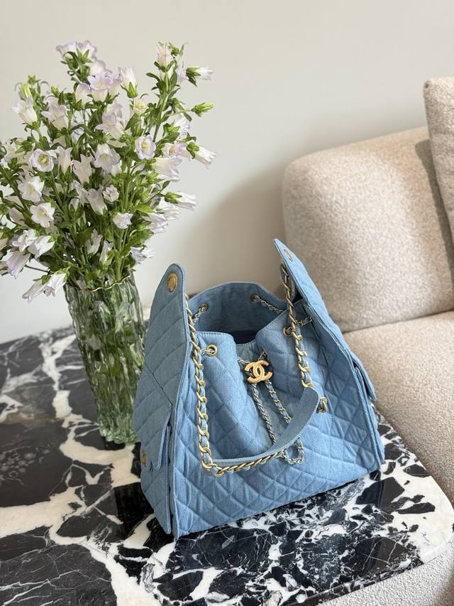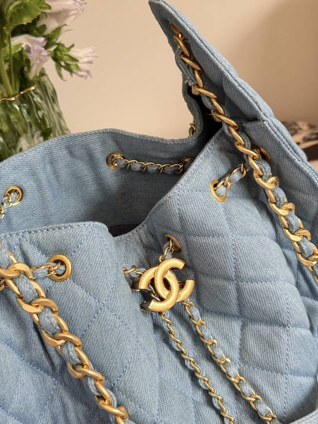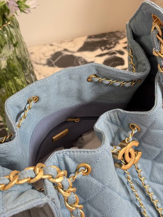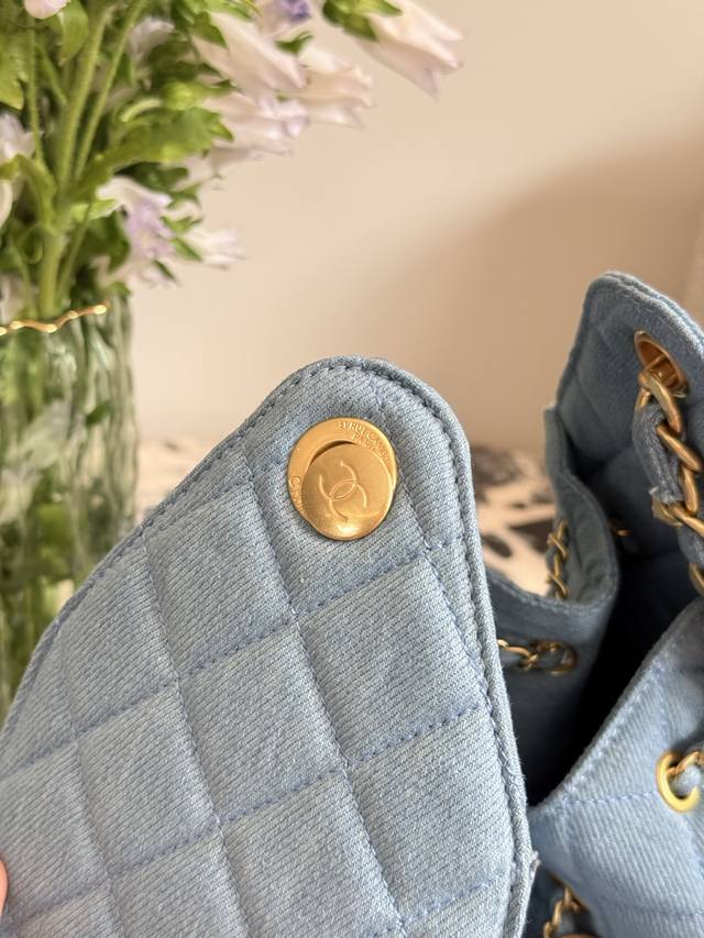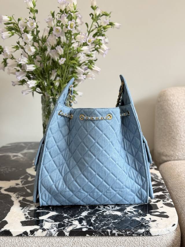 Retro Gold Coin Button Drawstring Bucket Bag + Diamond Pattern + Retro Denim With Leather