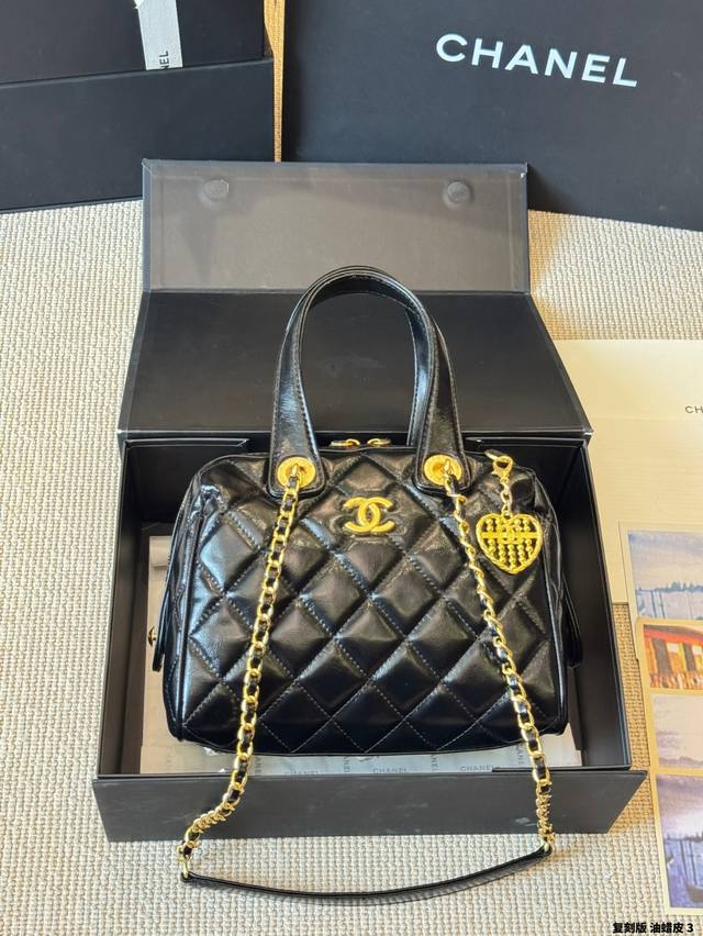 Chanel ~ 25A Black Gold Pleated Wax Cowhide Handbag Bowling Bag Shoulder Bag