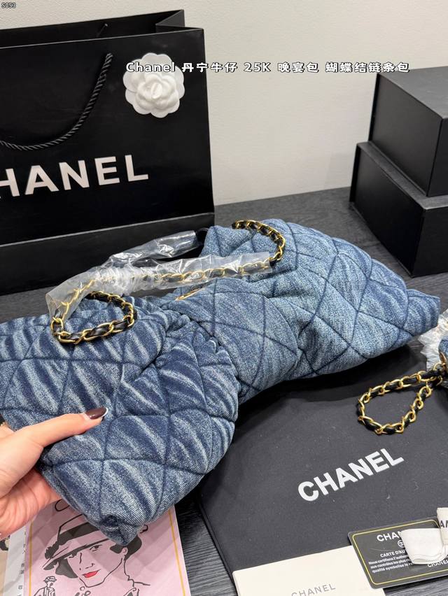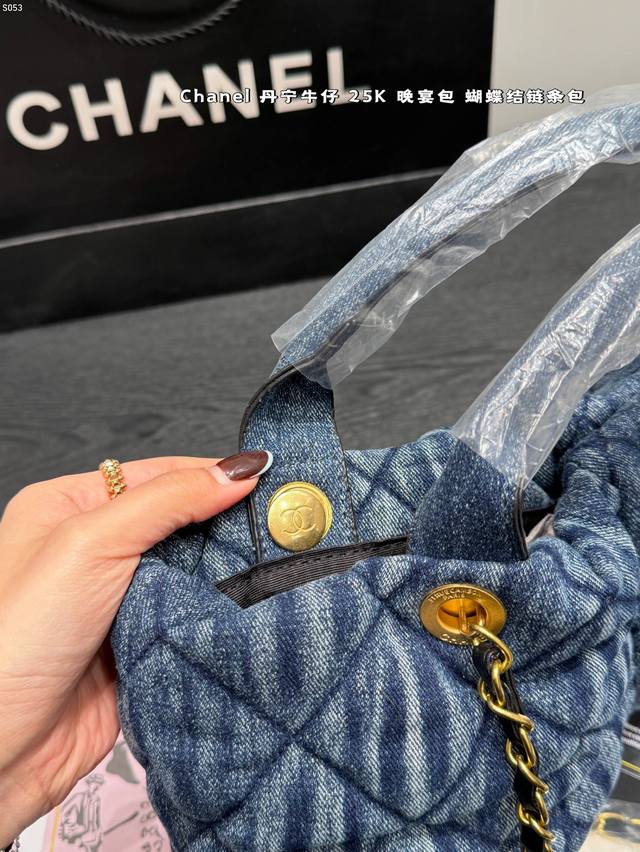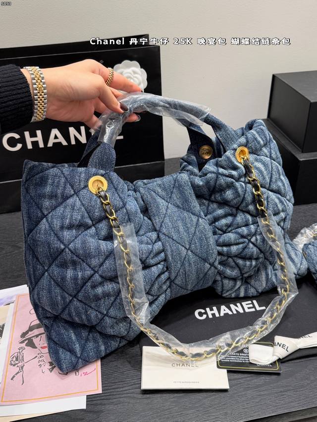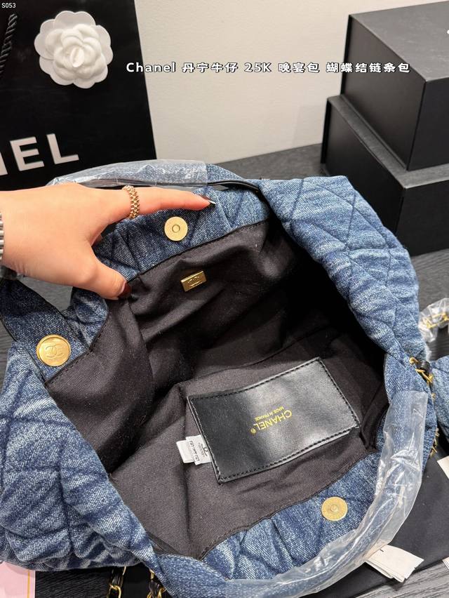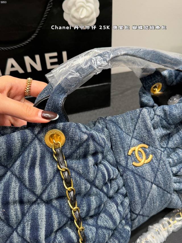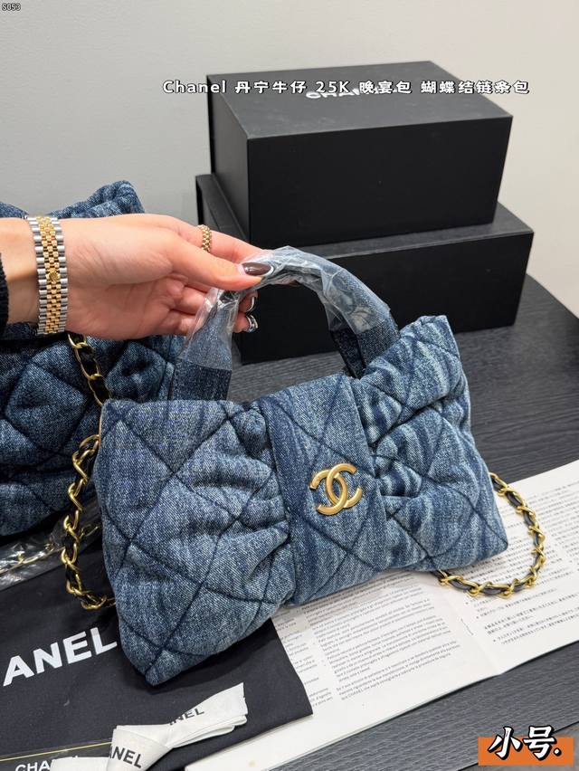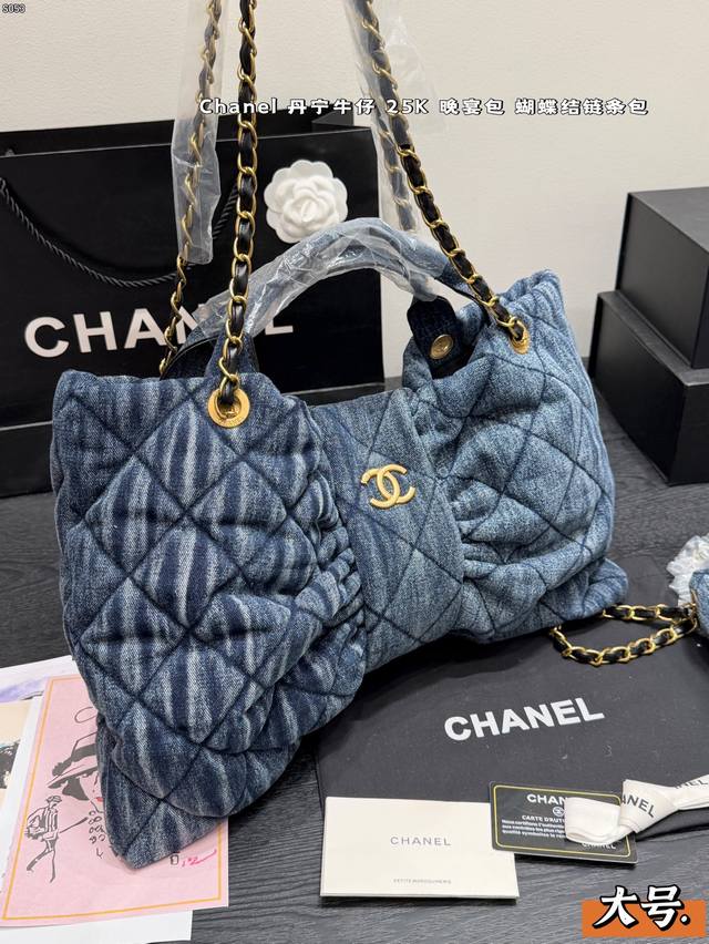 Gift Box Packaging DDD Chanel New Denim Bow Chain Bag DDD My Beloved Little Bag DDD Chanel 25K Evening Bag DDD Gold exudes elegance and a soft, high-quality feel DDD Both the front and back are full of style, making it irresistible at first sight DDD The chain is detachable, so it can be used as a clutch, evening bag, or for everyday crossbody or shoulder wear. It's a perfect bag DDD Size: Large 47*30cm, Small 30*18cm DDD
