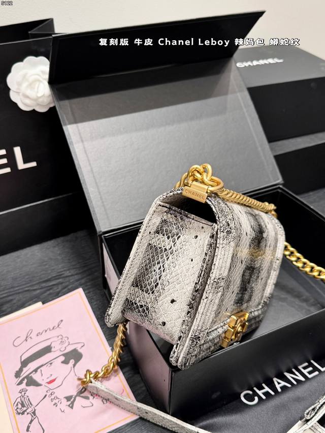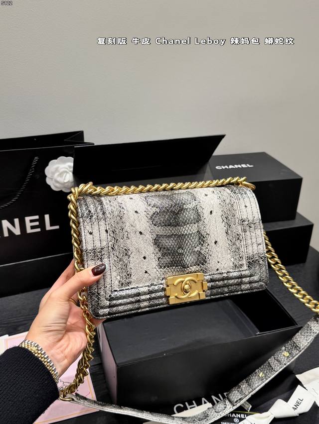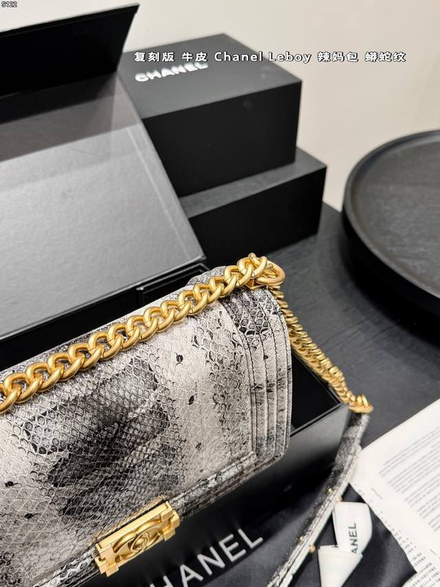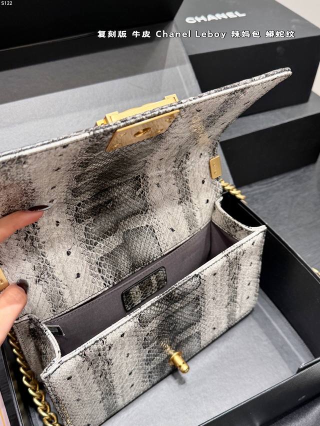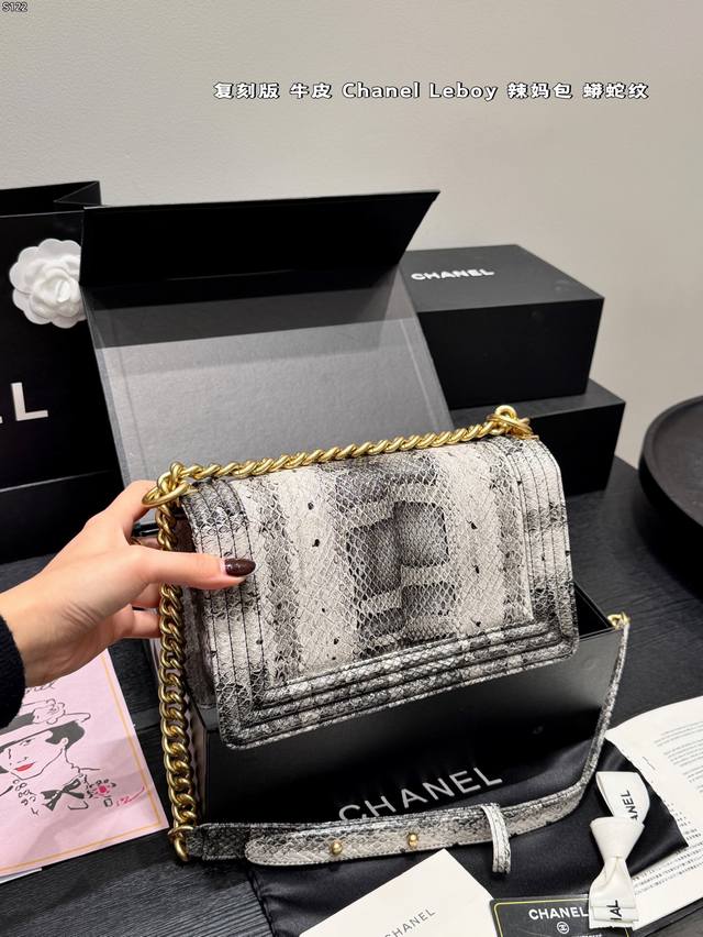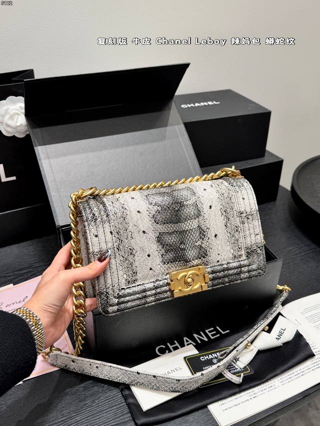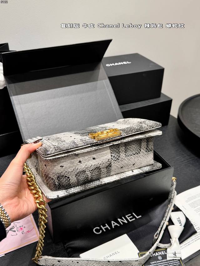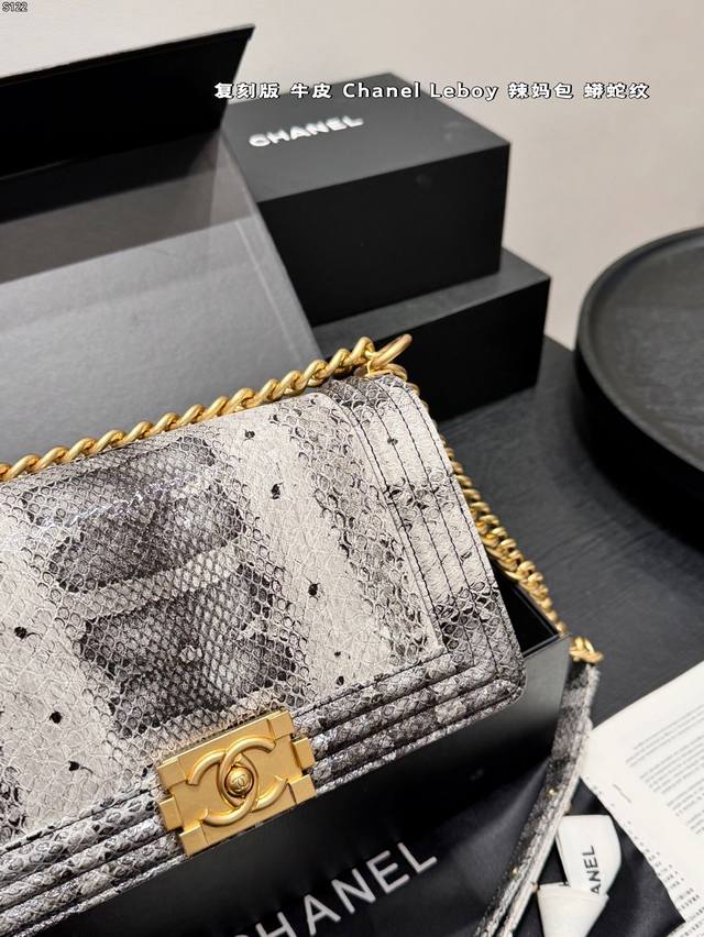 Gift Box Packaging DDD Replica! Genuine Leather DDD Chanel Le Boy Hot Mom Bag Genuine Leather Python Print DDD The Chanel Le Boy is truly exquisite and adorable to the extreme DDD But this 23A version features a quilted pattern with python print DDD Black and gold + exquisite + durable = perfect DDD It's just too cute DDD Original quality. The overall effect is superb. Unique and novel, a celebrity-endorsed style. Original hardware and logo. High quality DDD Size 25*15Cm DDD