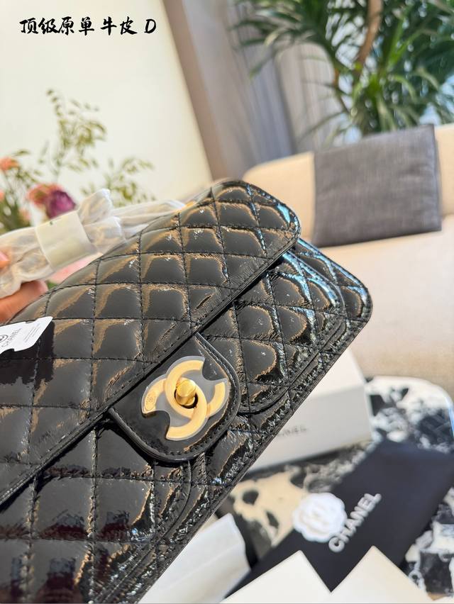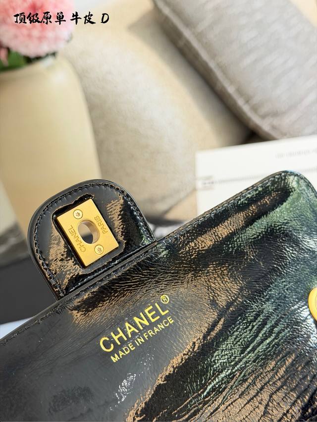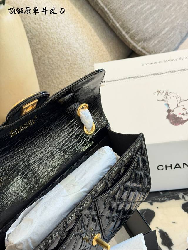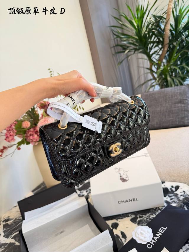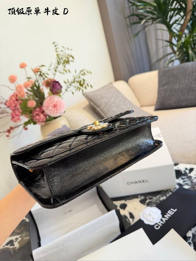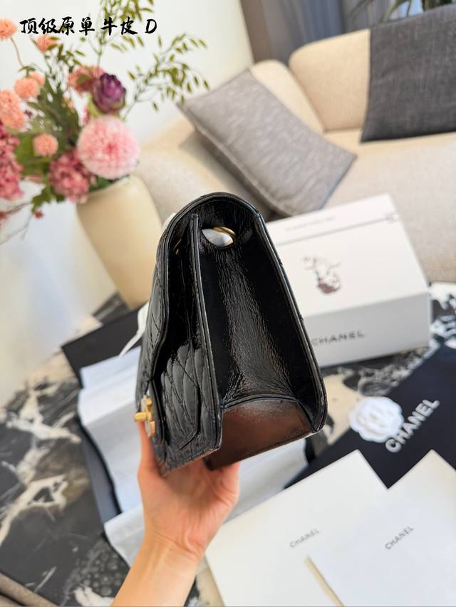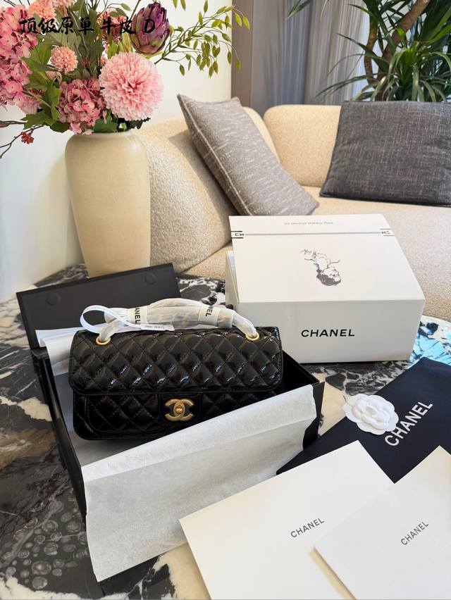 Glossy Waxed Leather Chanel 25B Pocket Bag DDD The Chanel 25B pocket bag, nicknamed the "baguette bag" due to its shape, is made of durable pebbled leather, featuring classic quilted stitching and vintage gold hardware. The bag has a structured shape with two small pockets on the front, adding a playful touch. It's more practical than the CF bag, easily accommodating a phone and lipstick. The adjustable chain shoulder strap makes it convenient for shoulder or crossbody wear, making it incredibly versatile for everyday outings. 25cm double-box packaging DDD