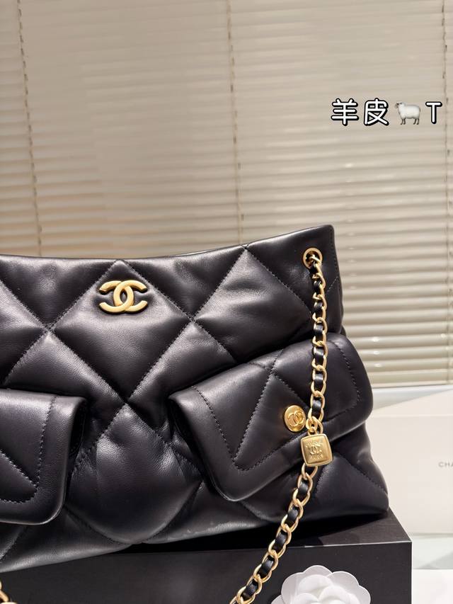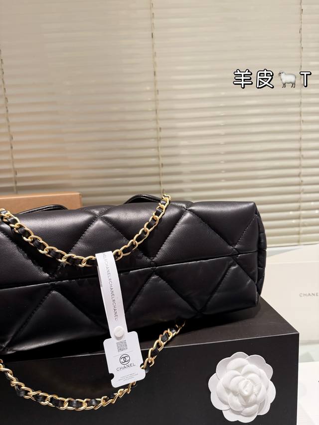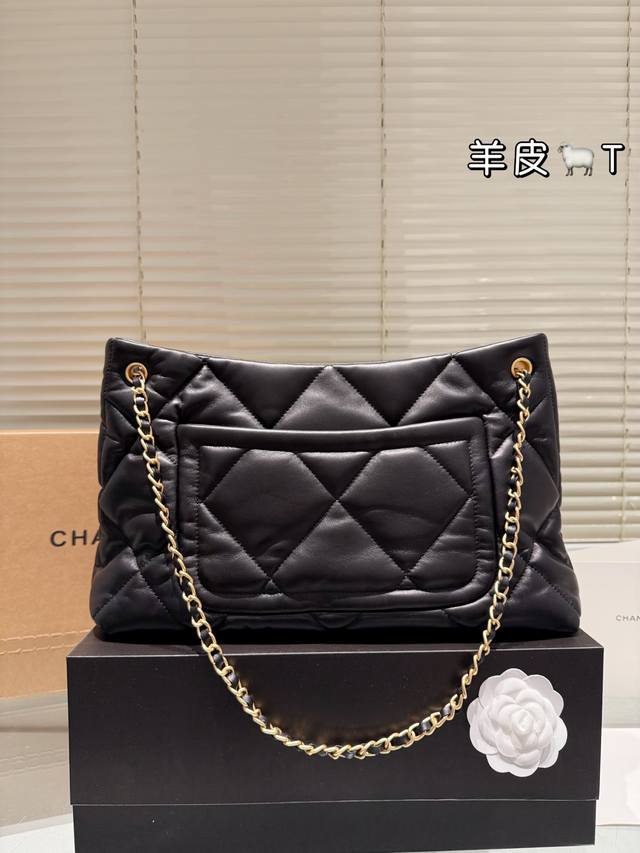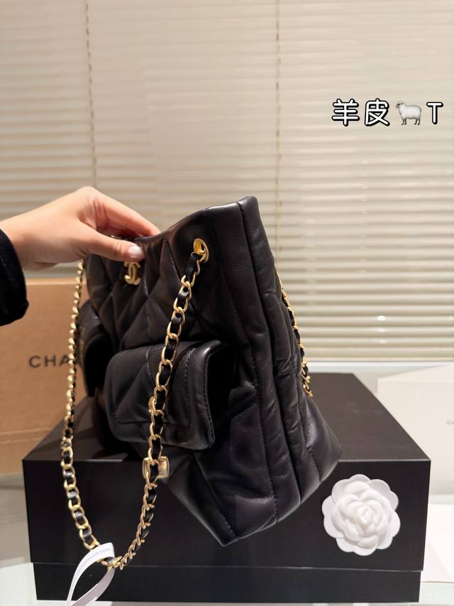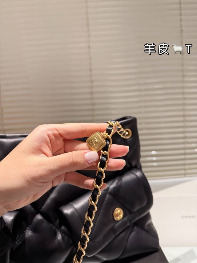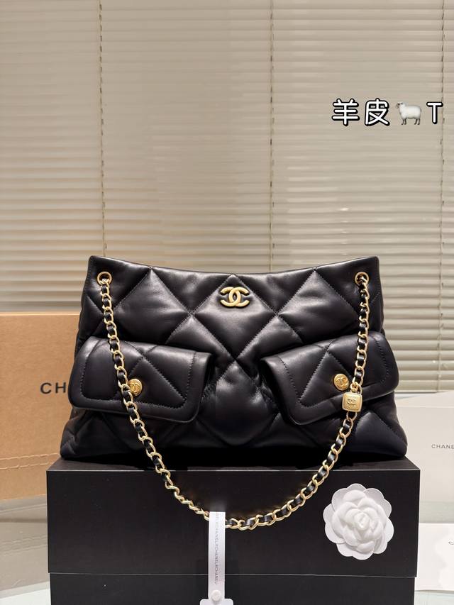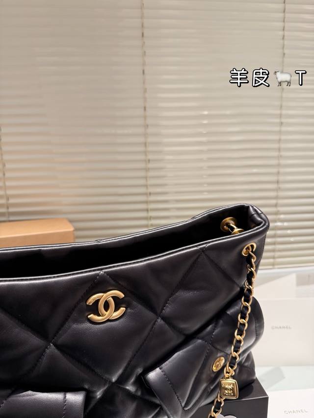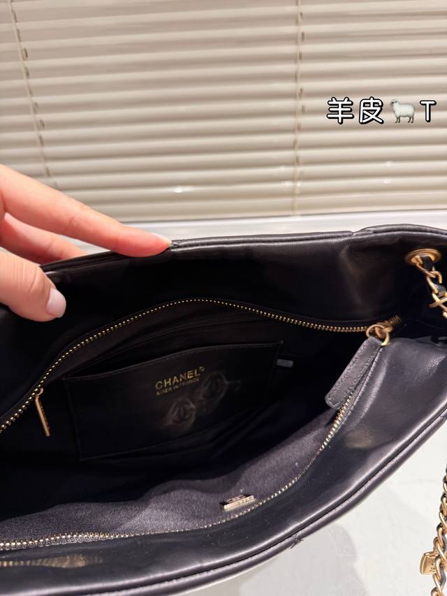 Lambskin Chanel 25K Black Gold Hobo Tote Bag DDD This Chanel 25K black gold Hobo tote bag features classic quilted stitching and double C hardware, with a highly recognizable chain and small gold plaque. Made of soft and durable lambskin, the black color is versatile and a must-have for autumn and winter! The bag has a relaxed and casual shape, a large capacity, and excellent storage with front and back pockets and compartments. Measuring approximately 39 x 8 x 26 cm, it's suitable for both commuting and casual occasions. The chain can be carried by hand or over the shoulder, making it flexible, versatile, practical, and stylish. It's a popular autumn/winter item and also holds its value well! DDD