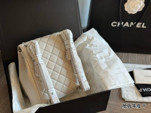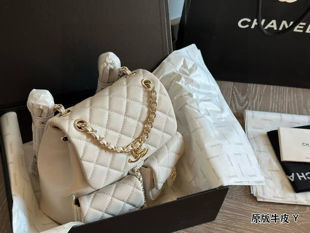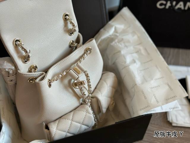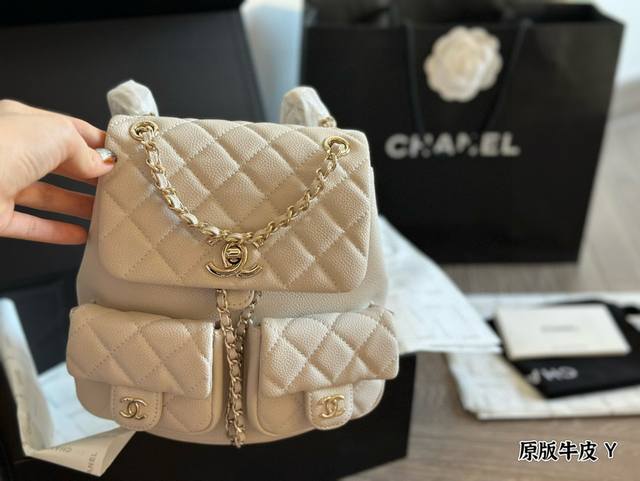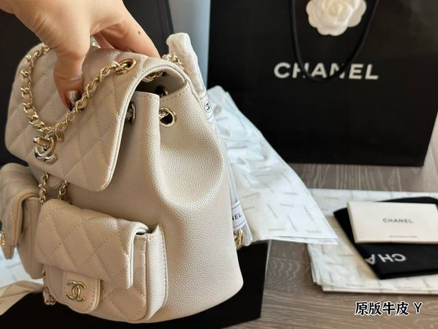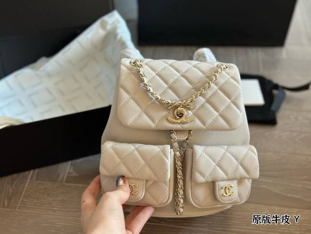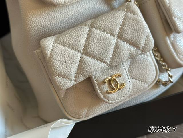 Original cowhide Chanel Duma frog backpack. The Chanel Duma frog backpack is named for its adorable double-pocket design, resembling two big eyes. The double-pocket design is more structured and narrower than a single-pocket Duma, resulting in a more fitted look. The interior is spacious, and a drawstring at the opening allows for easy tightening. It offers good anti-theft protection. The shoulder straps are partly puncture-resistant chains and partly leather, with adjustable buckles and holes for length adjustment. For those who want to use it as a backpack but don't want the feel of a schoolbag, choose the medium size. Sisters over 165cm should definitely go for this size