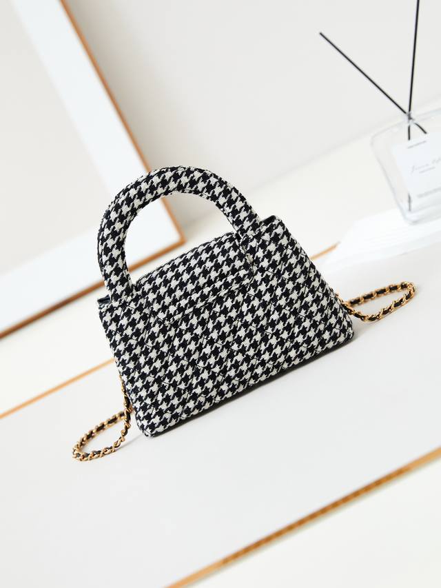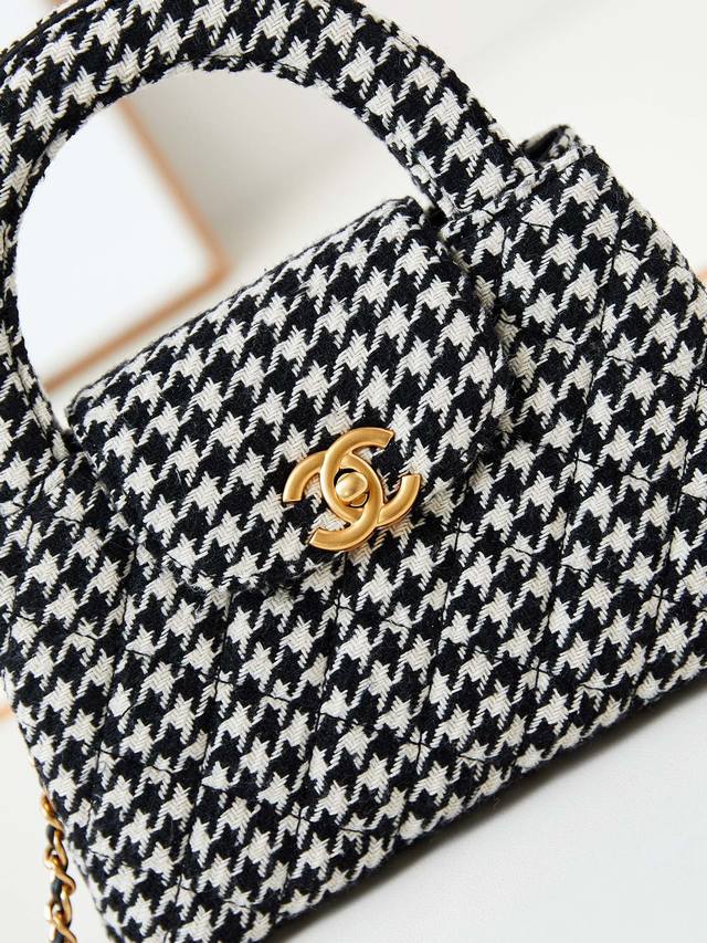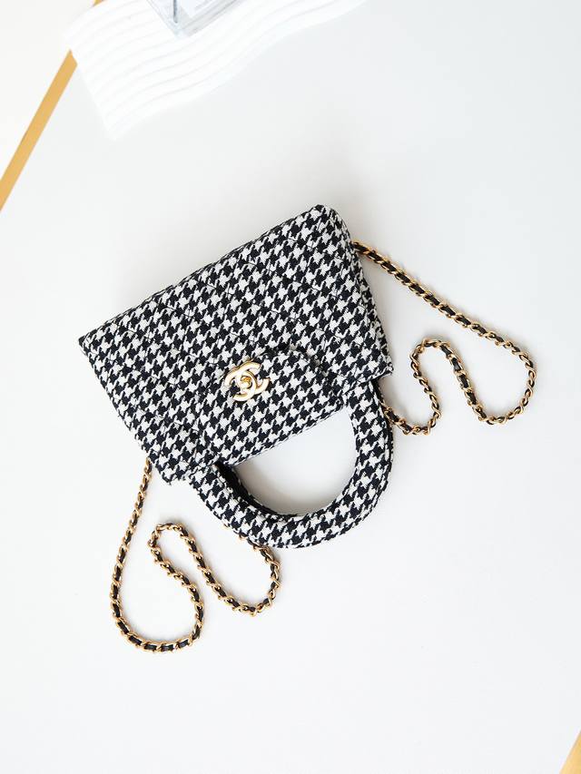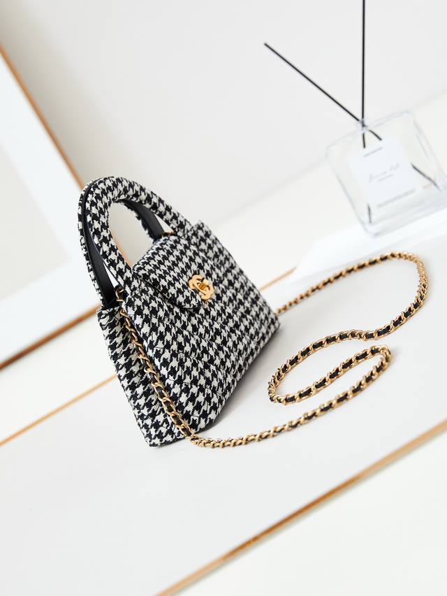 23K Kelly Handle Bag in Houndstooth Fabric. Fashion is cyclical; the highly sought-after vintage Kelly bag has been redesigned and revitalized by Chanel. Famous for its classic handle, the vintage Kelly bag now features a leather-threaded chain shoulder strap, subverting tradition for a more casual and convenient look. Style number As4416. Size 13-19-7. Full packaging included.