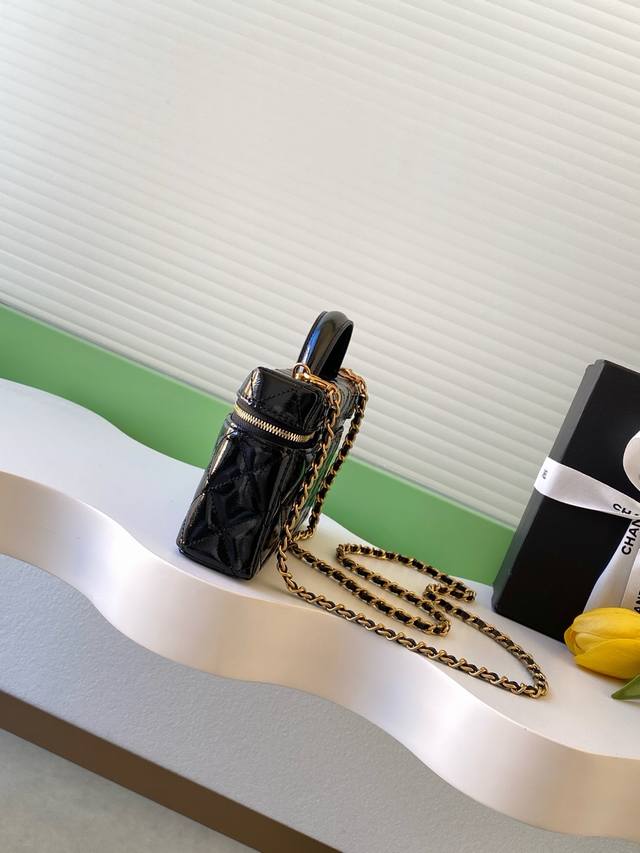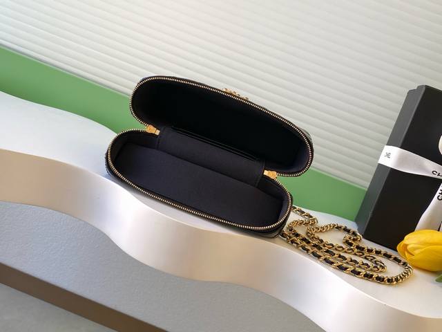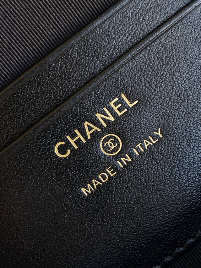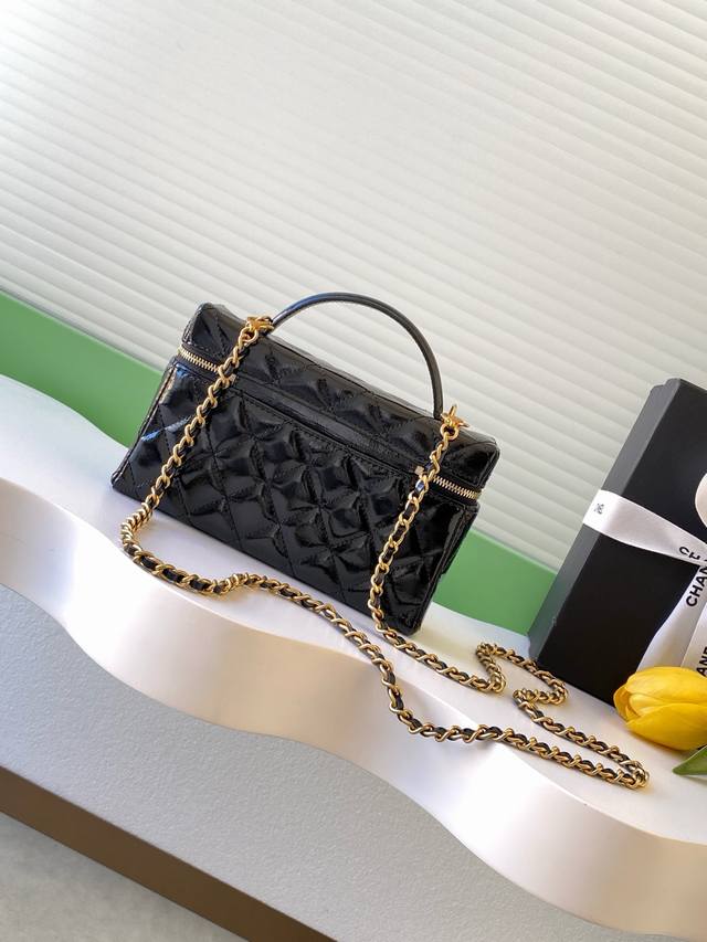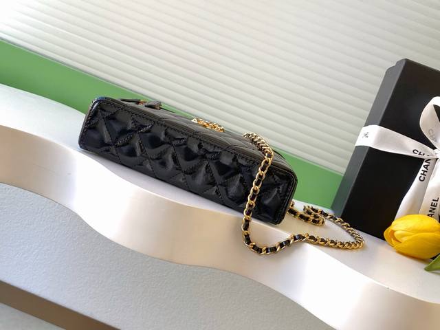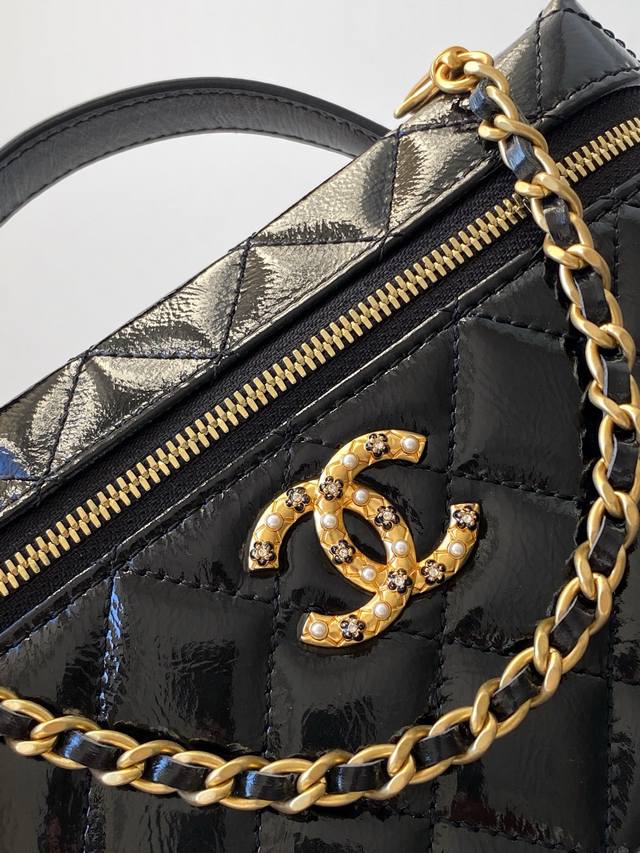 26C Black and Gold LP Lunch Bag, made of waxed lambskin with a rich sheen, durable and scratch-resistant. Features classic quilted pattern and vintage gold hardware, with the double C logo adorned with pearls and rhinestones