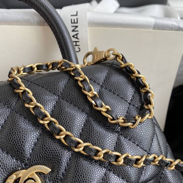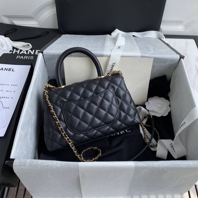92990 Black ball with black ball handle. The classic Chanel 1 design features a diamond pattern and snakeskin handle. Its eye-catching shape gives it an irresistible charm. Imported cowhide with small ball texture and gold accents provides a soft feel. The lambskin lining perfectly captures the essence of the Chanel 1.