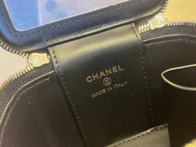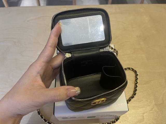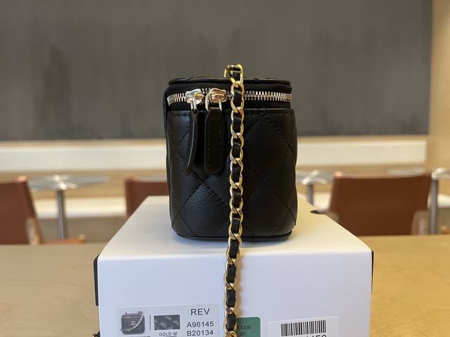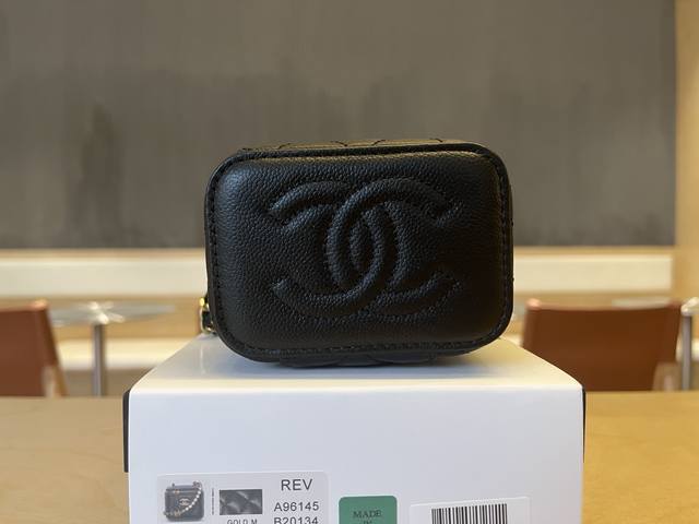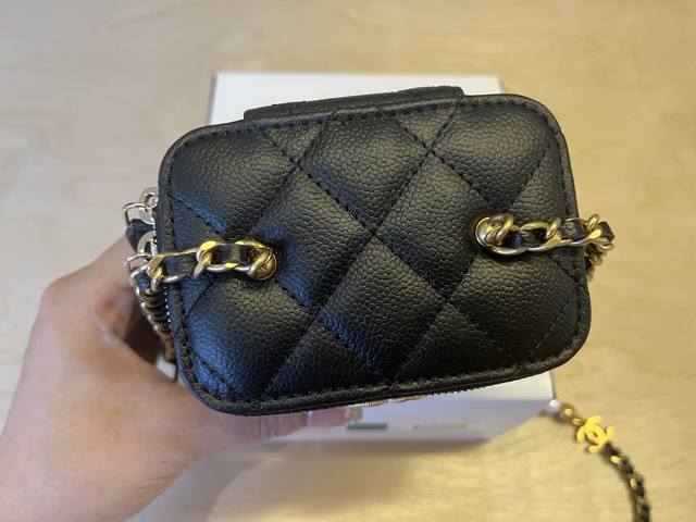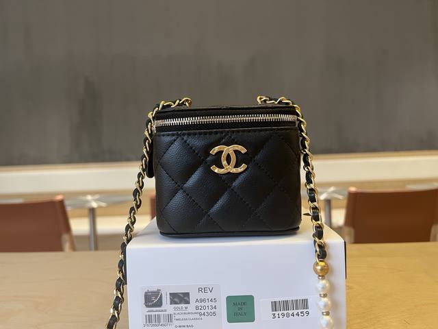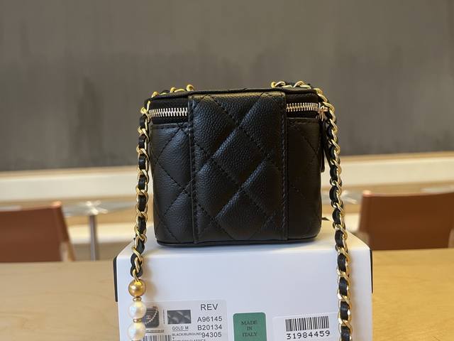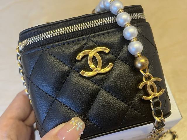 A96145 Chanel 25S Pearl Chain Lipstick Bag. Seven pearls on the chain sparkle brilliantly in the sunlight, making it impossible to look away! The pebbled leather has a built-in high-gloss filter, the quilted stitching is impeccably neat, and the double C logo exudes elegance! It's all about effortlessly slaying the scene with elegance! The bag looks petite but is surprisingly spacious! It can easily fit a phone, compact powder, and lipstick