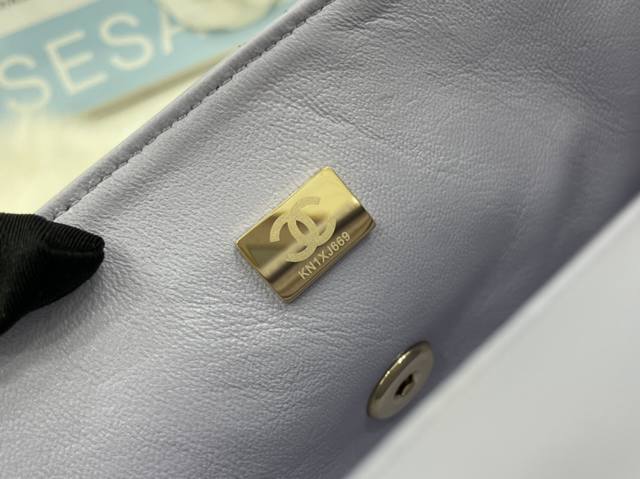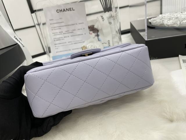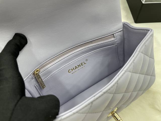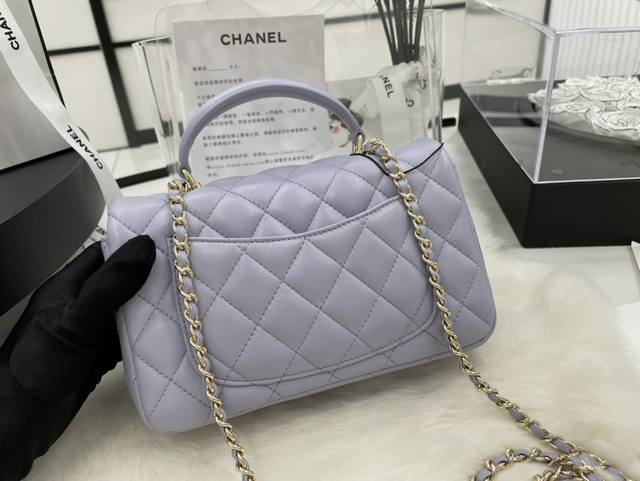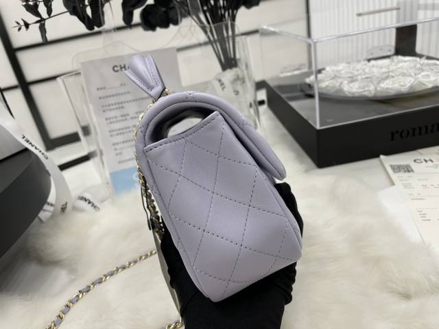 As2431 Lambskin Light Gold Chanel 21K Latest Mini CF Handle Bag. The classic quilted flap bag features a delicate chain handle. Made of supple lambskin, this handbag stands out, embodying timeless elegance. Dimensions: 20 x 12 x 6 cm.