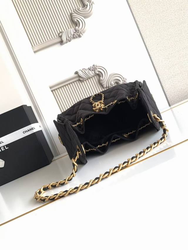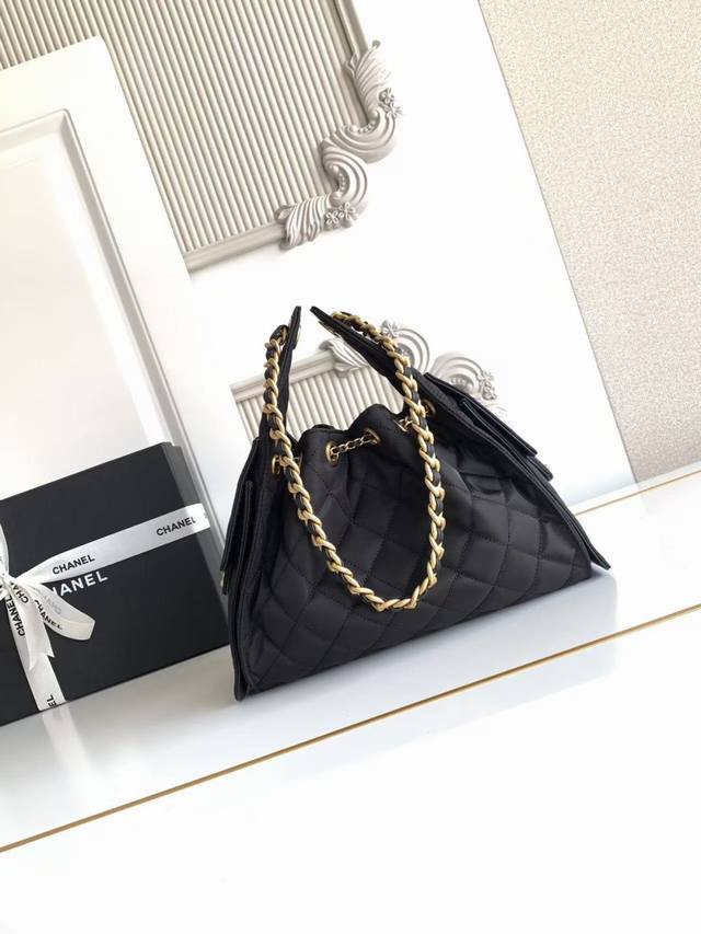 As5293 Chanel 25C: Another bag named after a year. This Chanel Hobo bag is a small, vintage-style bucket bag with a gold coin button and drawstring closure. It features a classic black and gold chain design and a quilted pattern, exuding sophistication ! A must-have for everyday wear, it boasts a beautiful appearance and delicate texture, easily complementing both casual and formal occasions. Dimensions: 30 x 26 x 14 cm.