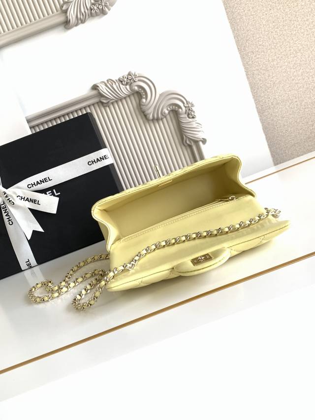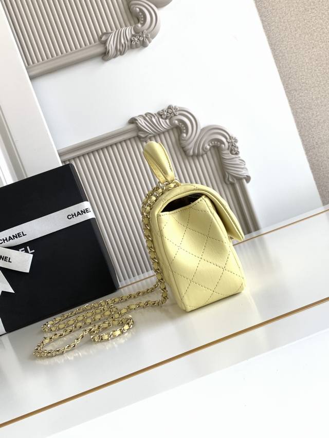 Chanel 21K Latest Mini CF Handle Bag As2431. A classic quilted flap bag with a delicate chain handle. Made of supple lambskin: a refined handbag that stands out and embodies timeless elegance. Dimensions: 20 x 12 x 6 cm.