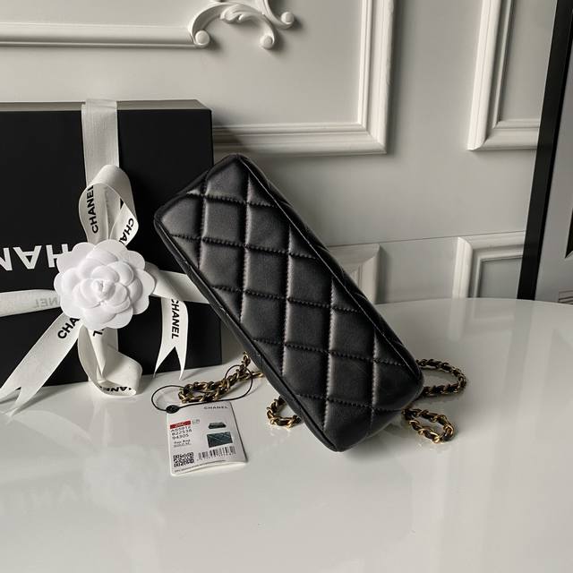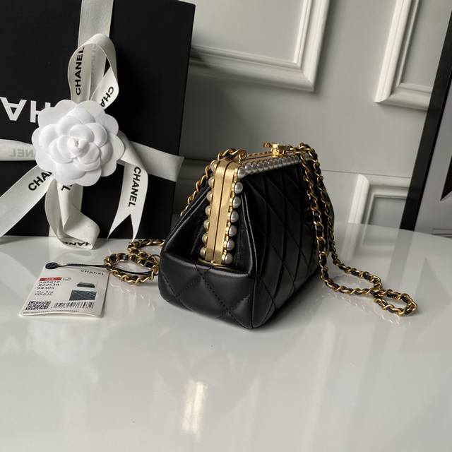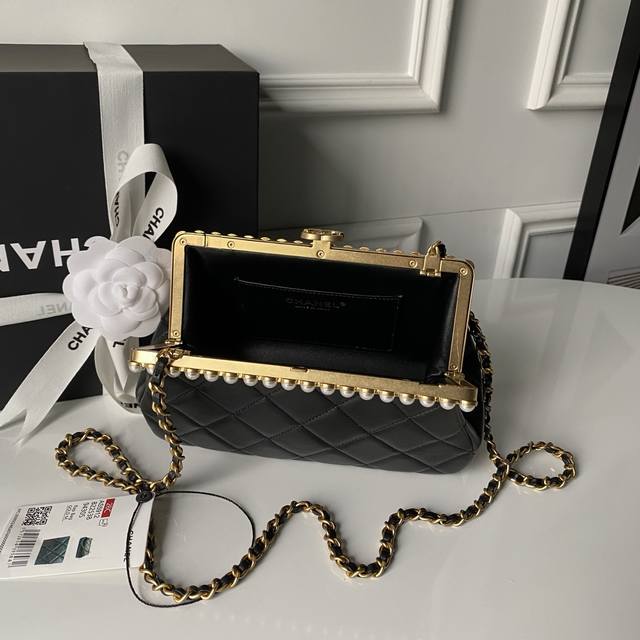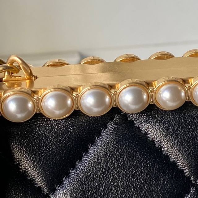 Chanel 26C Pearl Evening Bag As5912. Exuding a luxurious feel, this bag features soft and delicate lambskin leather with neat diamond-quilted stitching, a signature Chanel technique. The gold-tone hardware is highly polished and durable. Compact and exquisite, it can be carried by hand or crossbody via chain. Pearl embellishments along the edges, combined with the metal chain shoulder strap, create a striking contrast between the softness of the pearls and the sophistication of the metal, adding an elegant and luxurious touch. The pearl element further enhances the bag's feminine appeal, making it a versatile and sophisticated accessory suitable for both everyday wear and formal occasions. Dimensions: 10