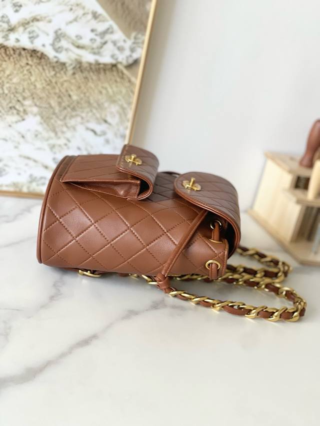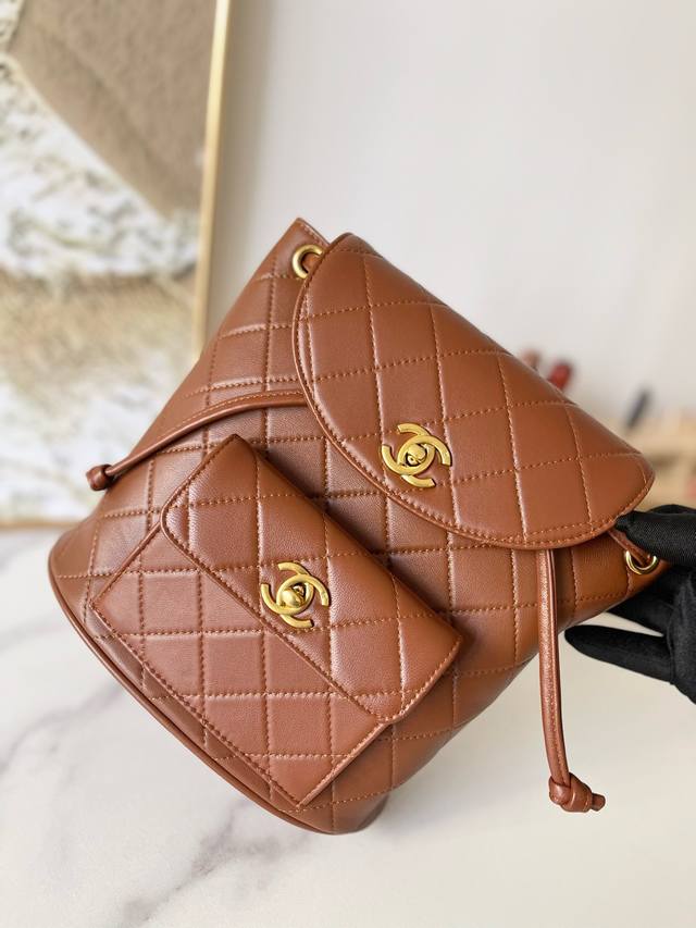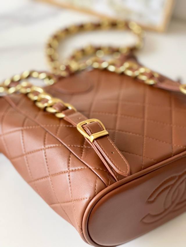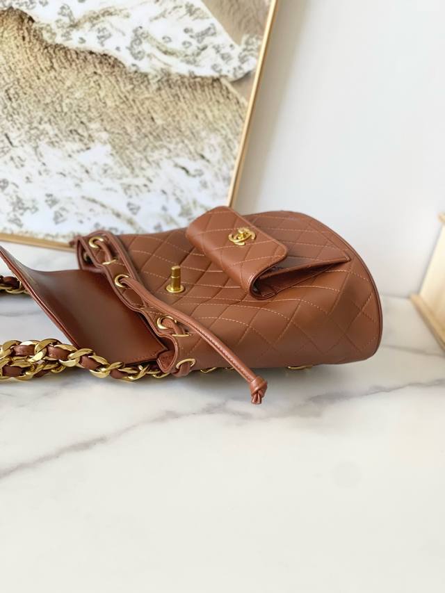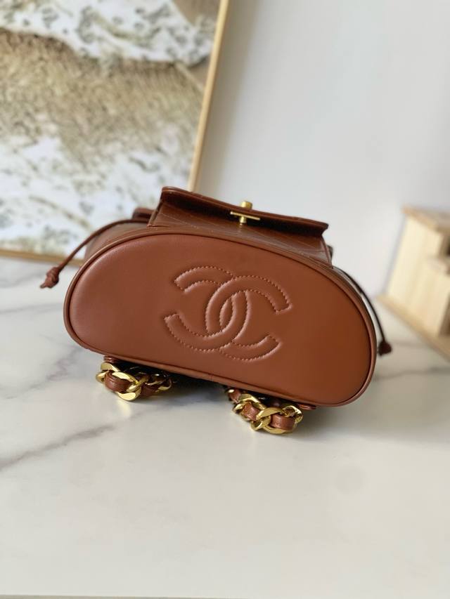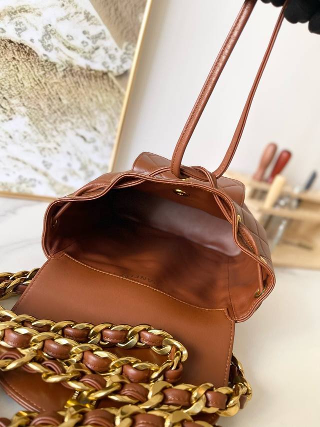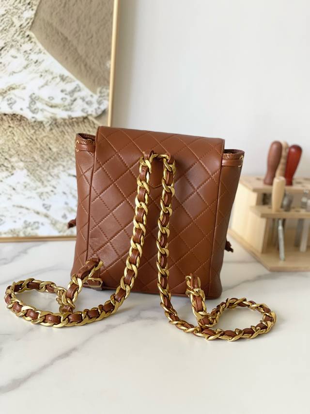 Chanevintage Backpack DDD It's no exaggeration to say this is a vintage backpack that can be passed down through generations! The classic double C logo, quilted pattern, and gold-tone metal chain shoulder strap exude quality. The soft and delicate lambskin makes it irresistible to own and cherish! It can be used all year round and complements any style. A must-have in your bag collection DDD Dimensions 21 x 10 x 20.5 cm DDD Item No. A2210 Large DDD Lambskin Caramel Brown DDD
