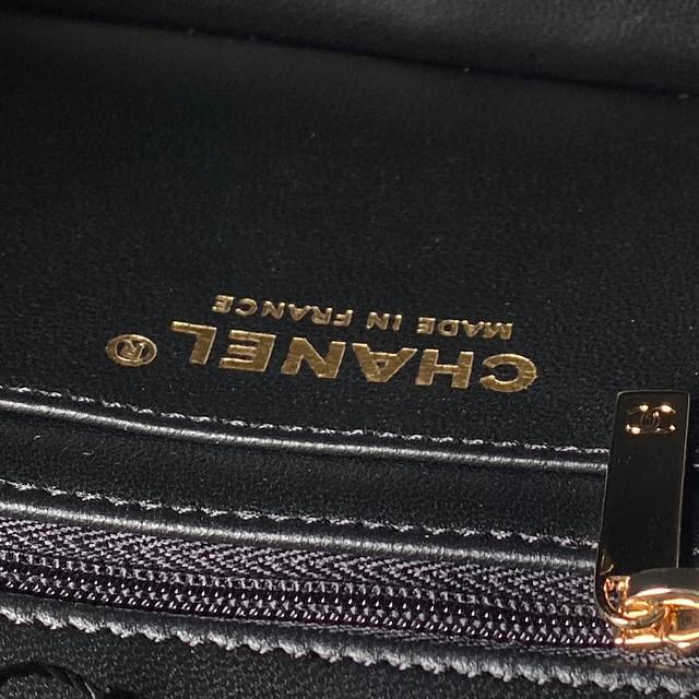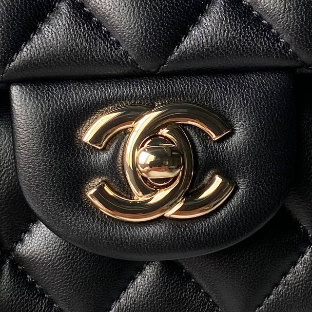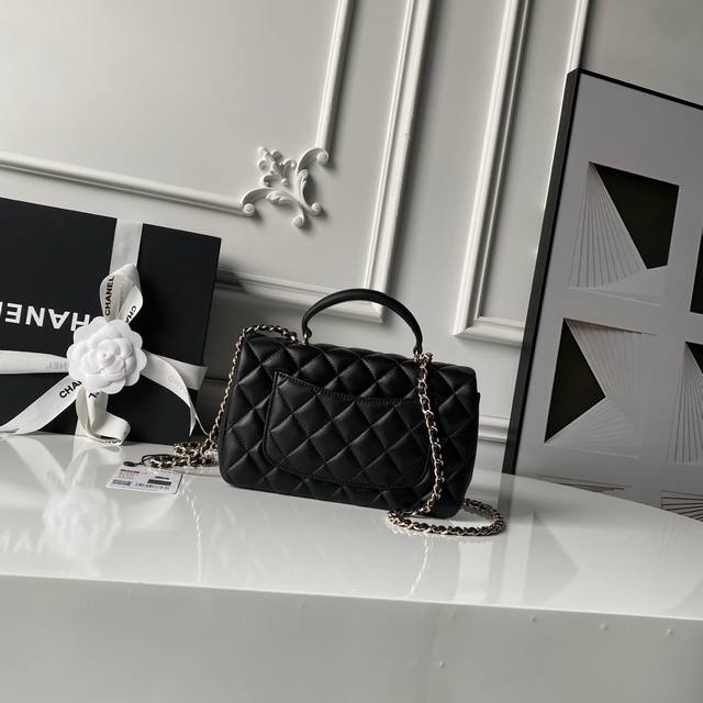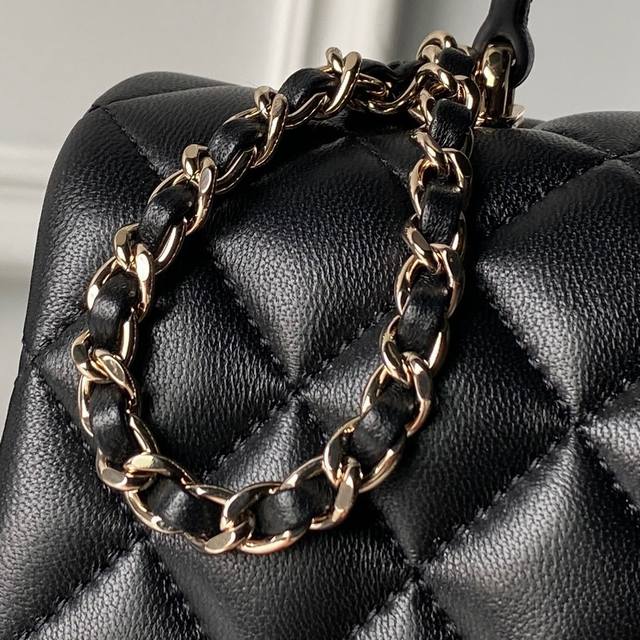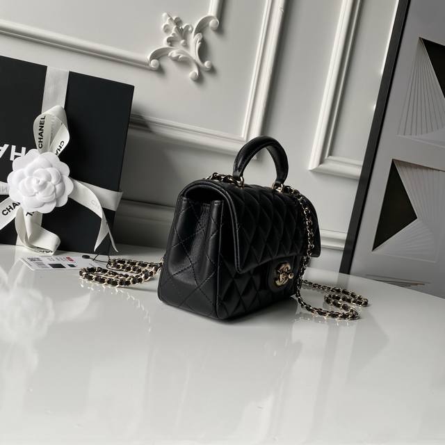 Light Gold Chanel 21K Latest Mini CF Handle Bag As2431. A classic quilted flap bag with a delicate, classic chain handle. Made of supple lambskin: a refined handbag that stands out and embodies timeless elegance. Dimensions: 20 x 12 x 6 cm.