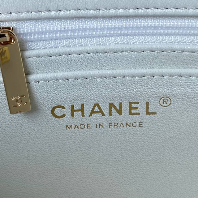 Light Gold Chanel 21K Latest Mini CF Handle Bag As2431. A classic quilted flap bag with a human head charm and a delicate classic chain handle. Made of fine lambskin: a refined handbag that stands out and embodies timeless elegance. Dimensions: 20 x 12 x 6 cm.