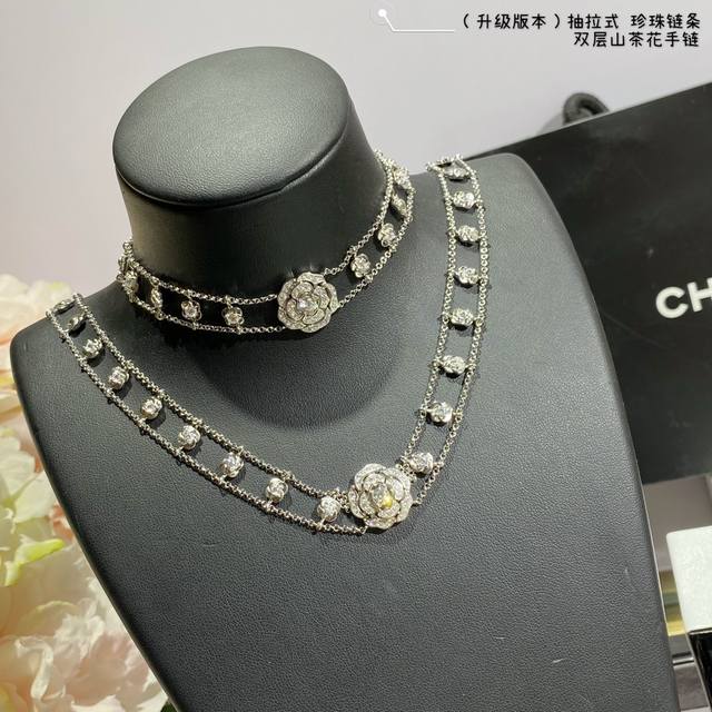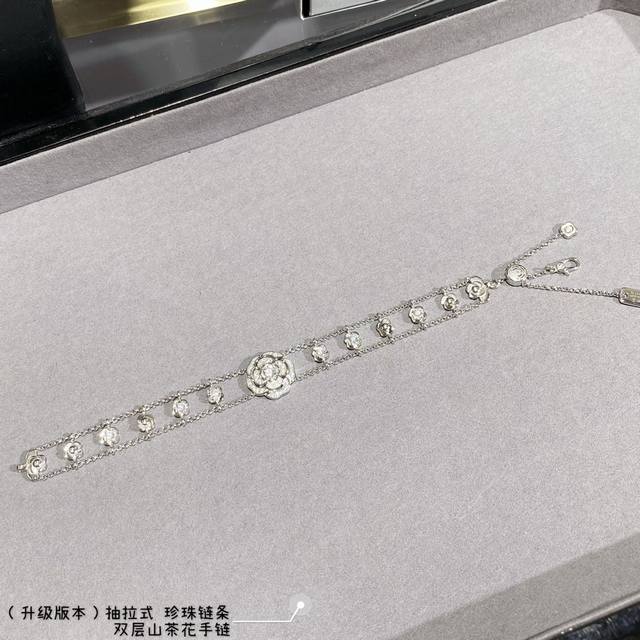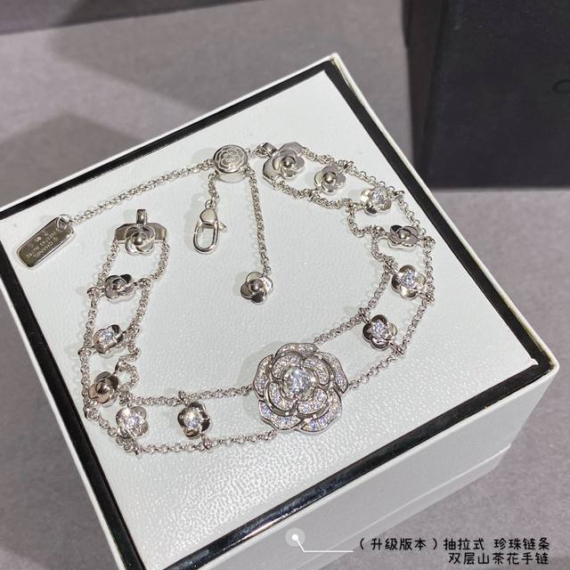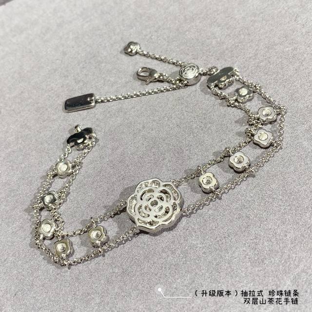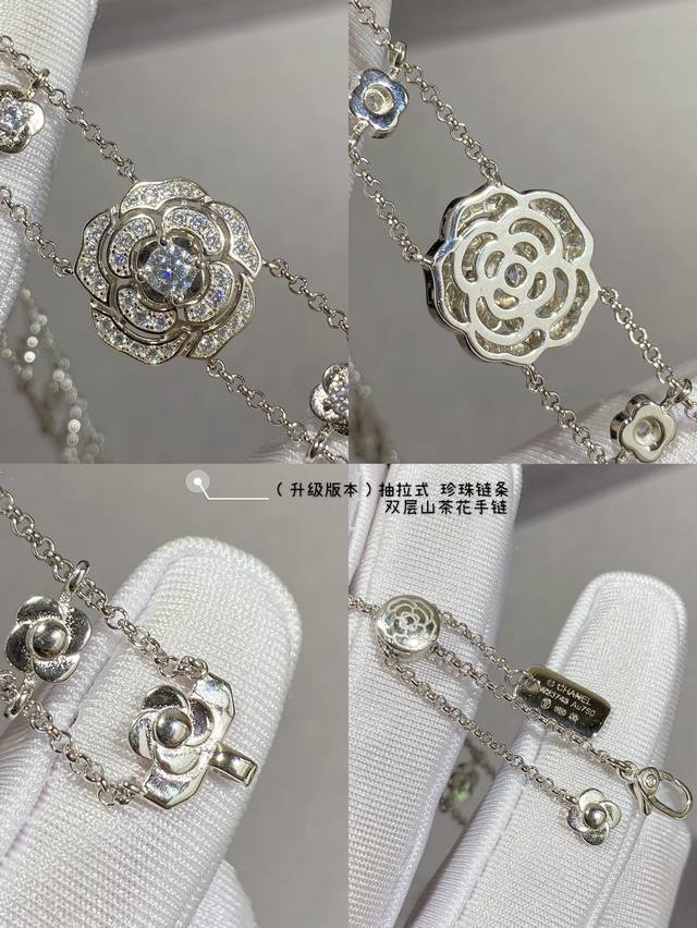 New version, with a retractable pearl chain at the back, V-gold material 8690440. This Chanel Camellia double-layer bracelet