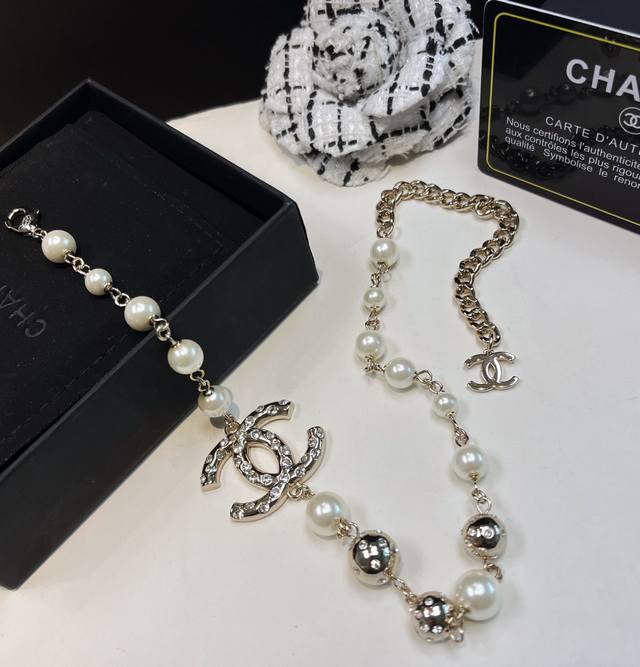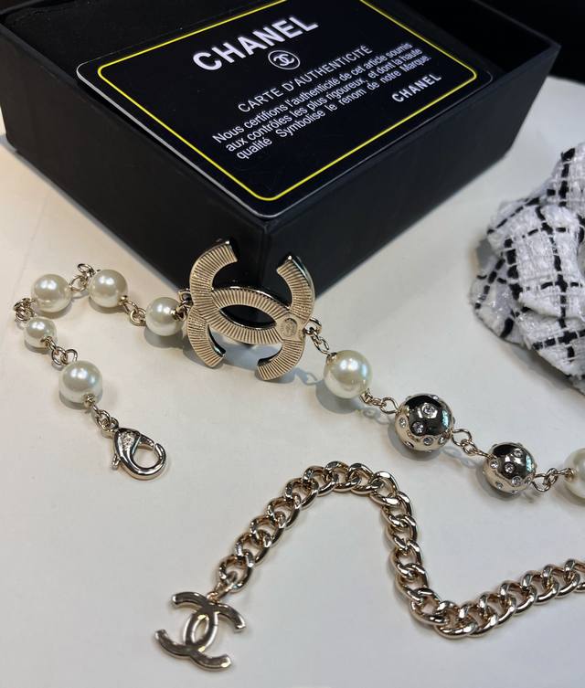 Shan Yichun's same Chanel light gold rhinestone double C short necklace with polished metal balls and large and small pearls. The metal balls and double Cs have an uneven texture and are covered with crystal diamonds of various sizes. The design sparkles in the sun. Whether worn alone or layered, it is very exquisite and everyday.