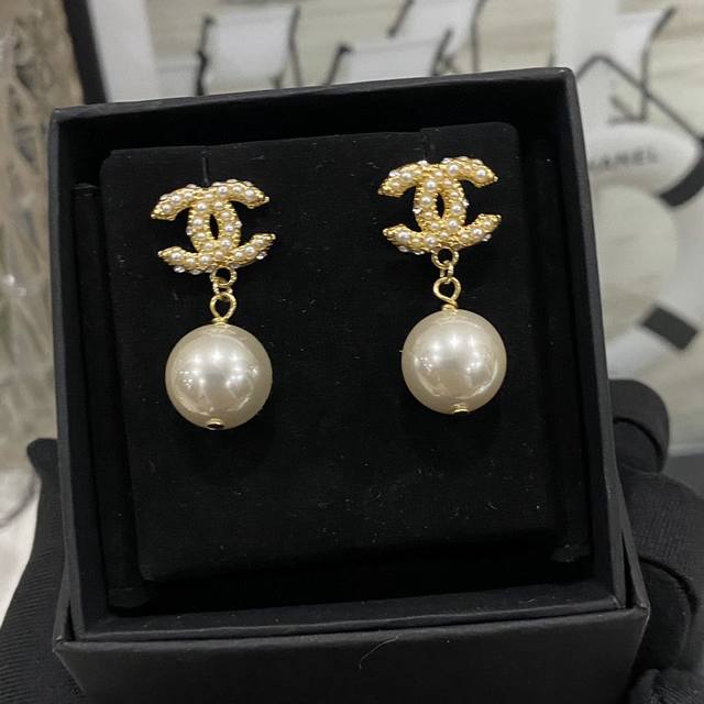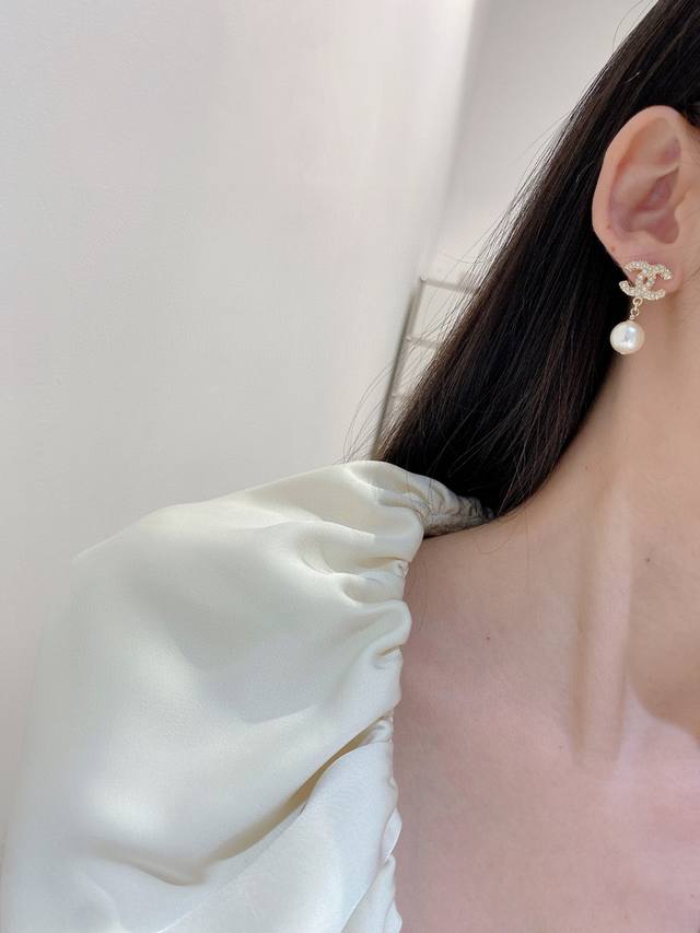 Small Chanel tassel long crystal pearl earrings, a classic collection, a true bestseller. Unique 3D design, lettering, side crystal diamonds and pearls, stunning! Original logo print, celebrity-esque. Cam
