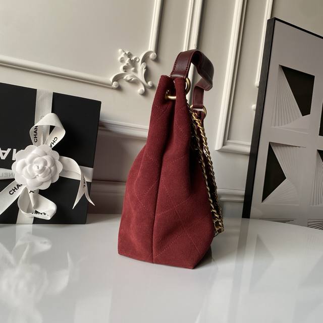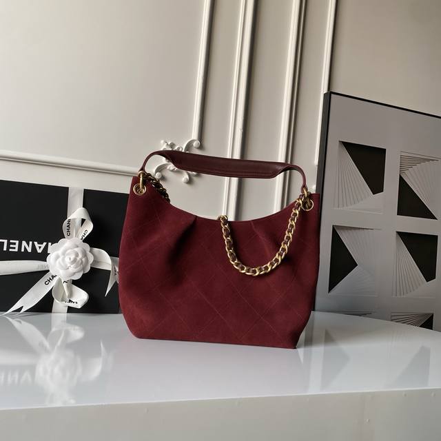 Suede Chanel 26C Early Spring Collection Hobo Hippie Bag As5970. The suede and metal surface has a delicate, short-pile feel, soft and skin-friendly. The vintage gold metal chain adds a retro touch, while the matching cowhide handles ensure durability and create a textured contrast with the suede, adding depth and sophistication to the overall design. It adds a highlight to the simple bag. The soft yet structured shape is also very elegant. It's effortlessly stylish, practical, durable, and has a large capacity. The overall look is very high-end. Dimensions: 23.5