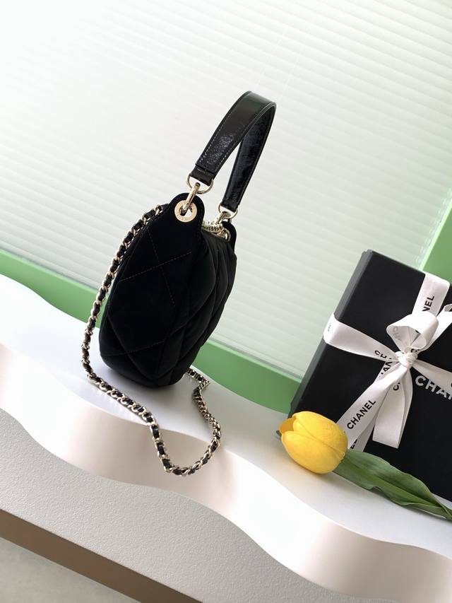 Top-quality replica Chanel 25N black velvet crescent bag. This year's semi-circular crescent bag also features a star mirror charm, doubling its cuteness. The leather-strapped metal chain is adjustable. It can be worn over the shoulder, crossbody, or carried by hand
